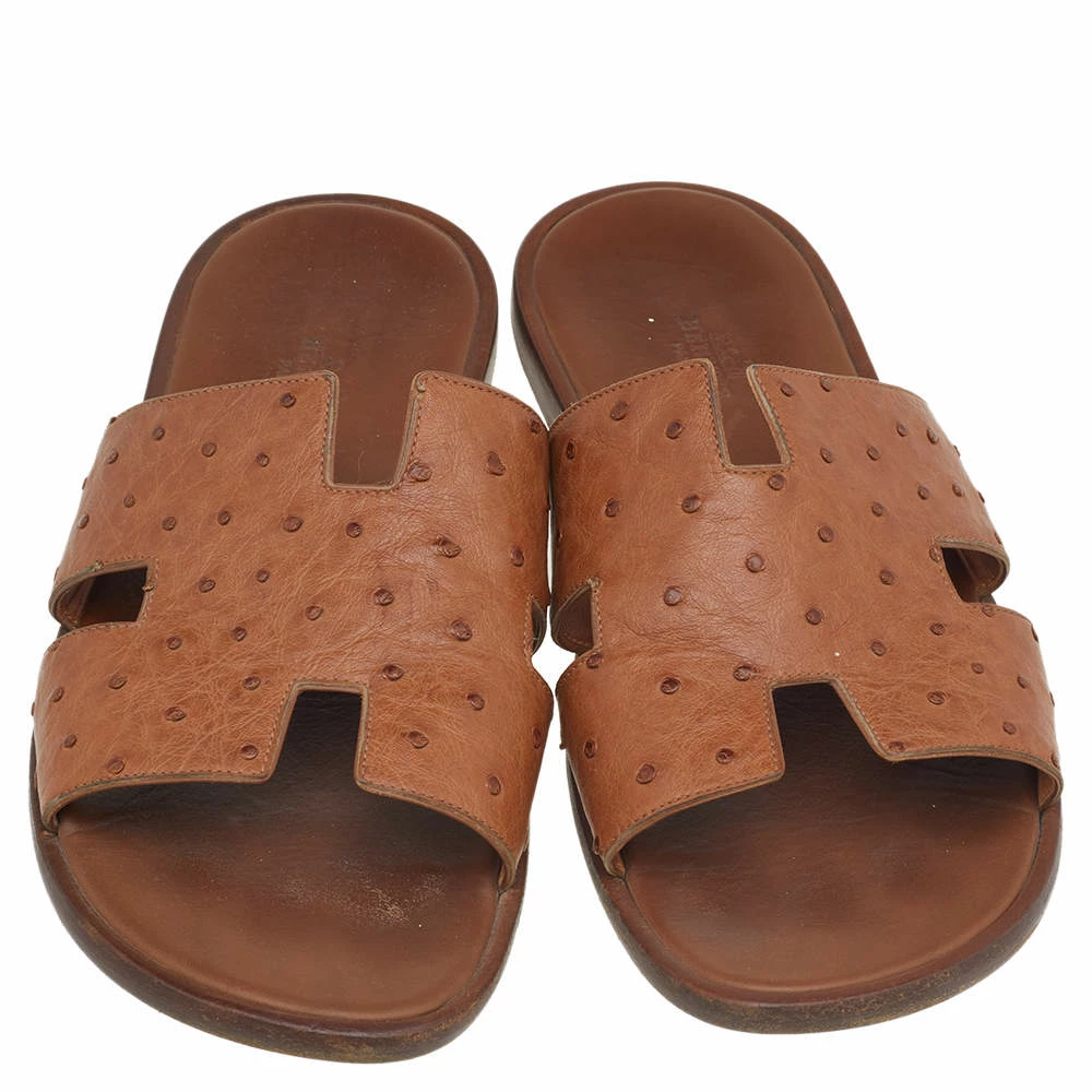Hermes is a brand that epitomizes art and all their designs have a luxurious blend of comfort and style. These brown Izmir sandals have been crafted from ostrich leather in Italy and feature the iconic H on the vamp, making it easy to slip on over all your casual outfits.