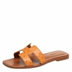 Add the iconic Hermès Oran sandals to your shoe collection with this pair. These orange Oran flat sandals have been crafted in Italy using ostrich leather and they feature the iconic H on the vamps and lined insoles to provide comfort at every step | Put your best foot forward this season in these pretty Hermes sandals. These Brown Oran sandals have been crafted from Ostrich Leather in Italy and they feature the iconic H on the vamps as well as insoles meant to provide comfort at every step. These sandals are sure to attract admirers!