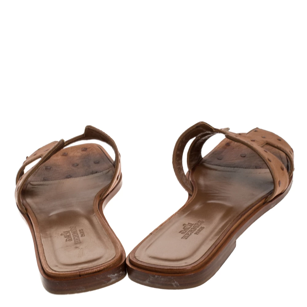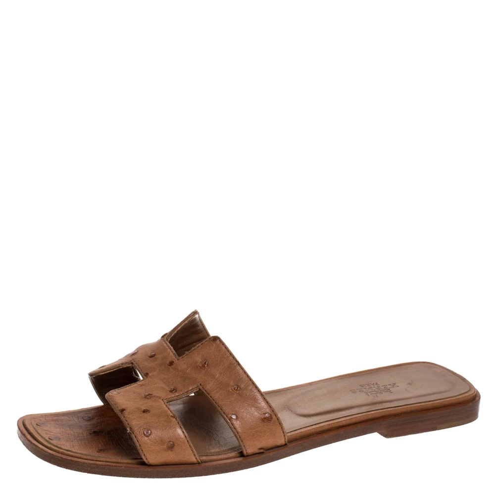 Put your best foot forward this season in these pretty Hermes sandals. These brown Oran sandals have been crafted from exotic ostrich leather in Italy and they feature the iconic H on the vamps as well as insoles meant to provide comfort at every step. These sandals are sure to attract admirers!