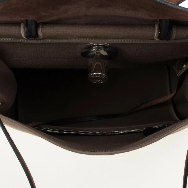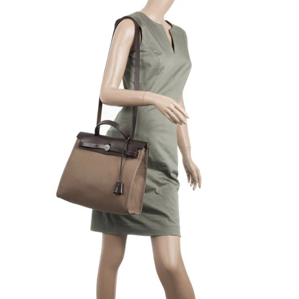 Carry this chic and functional Brown Herbag Convertible Satchel by Hermes along with you everywhere. The stylish exterior is crafted from brown toile canvas and smooth dark brown leather. The look is completed with a flap front closure, Hermes’s signature clochette, a padlock and keys, a top handle and a shoulder strap. Its roomy open interior is unlined and features a detachable pouch. The exterior comes with a zipped pochette. Final sale, no return.