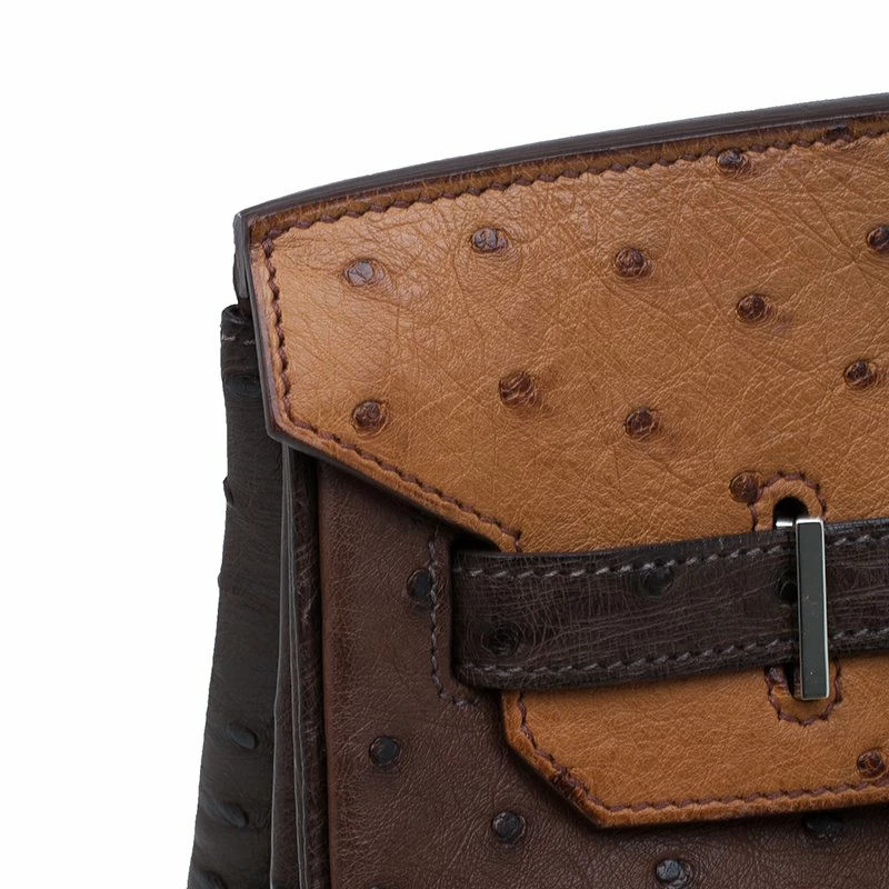 The elegant Hermes Birkin 35 remains an iconic bag, season after season! This masterpiece is crafted from exotic ostrich leather in tonal hues of brown. It features the iconic twist lock closure, padlock and leather key trinket supported in silver-tone palladium hardware. This bag comes with double handles and protected bottom. Its spacious interior is lined with leather and features a single zip pocket and two patch pockets.
