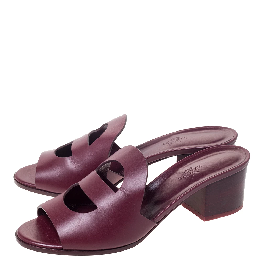 These burgundy slide sandals by Hermes are defined by cutout detailing on the leather uppers and open counters. They feature open toes, leather insoles and 5 cm block heels. The “Mona” sandals are easy to slip on and off.
