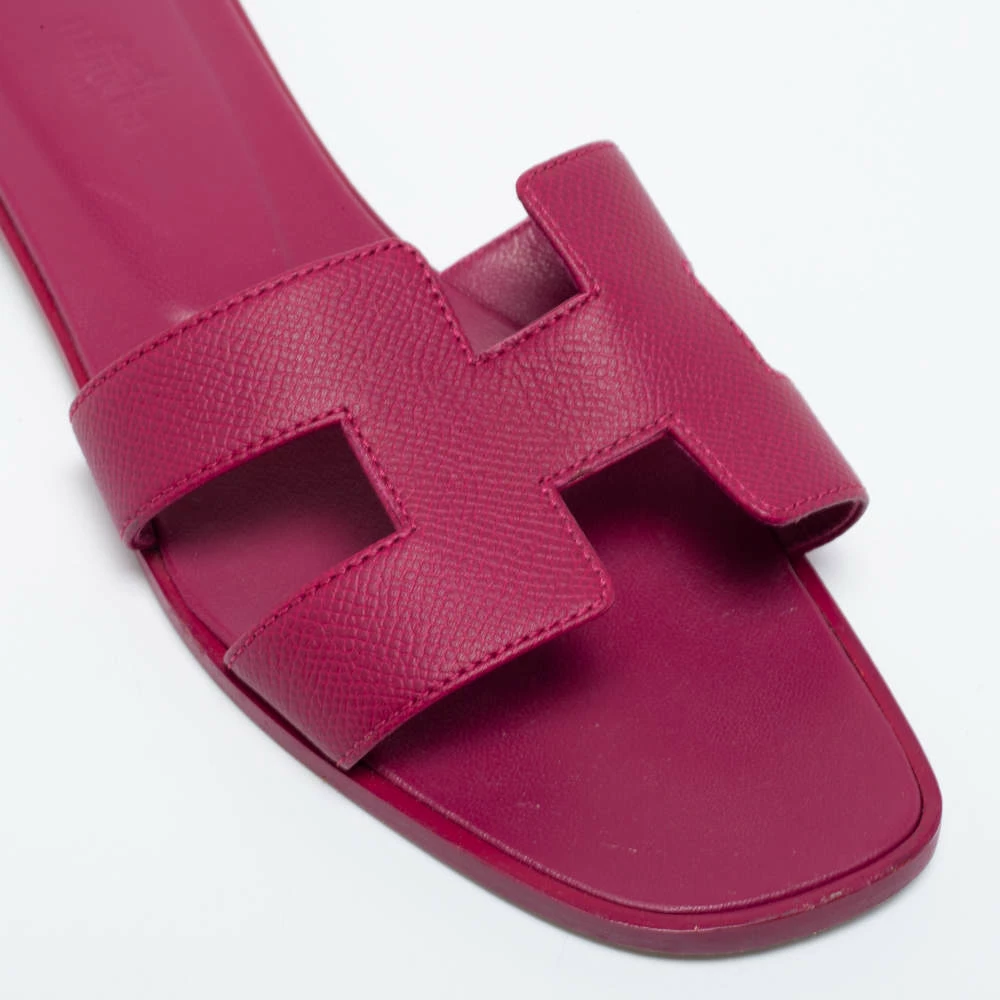 Put your best foot forward this season in these pretty Hermes sandals. These burgundy Oran sandals have been crafted from leather in Italy and they feature the iconic H on the vamps and the durable insoles are meant to provide comfort at every step. These sandals are sure to attract admirers!
