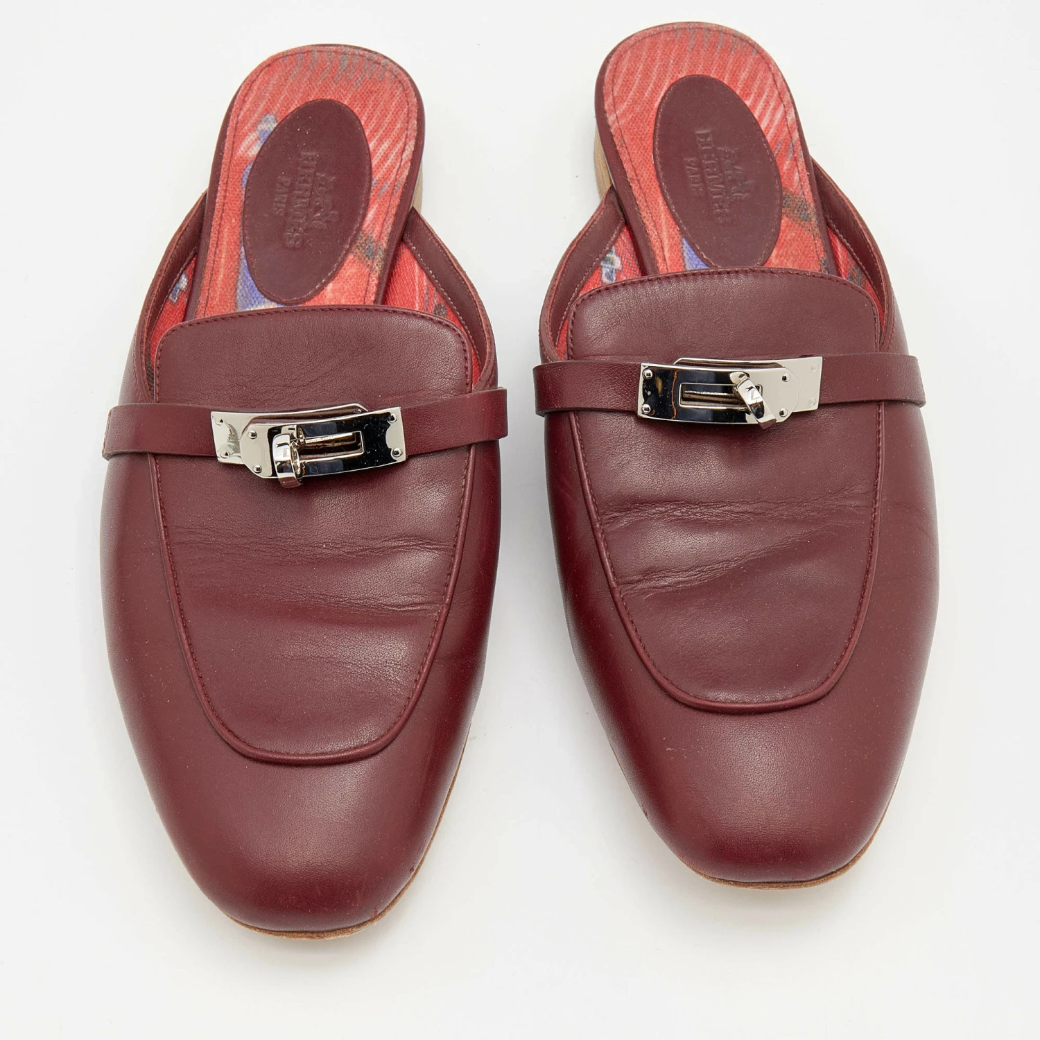 Designed in a loafer style, these Oz mules are from the house of Hermes. They are beautifully crafted in burgundy leather with the signature twist-lock in palladium-plated metal on the vamps. Slip these flat mules on for a comfortable urbane style.