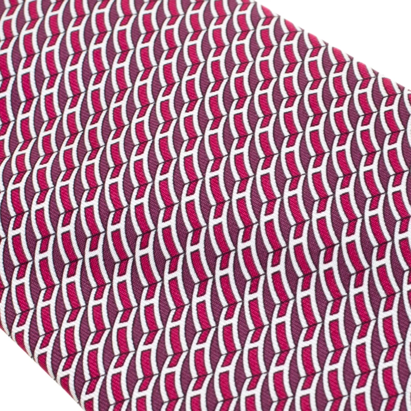 The classic geometric patterned silk tie makes for a versatile accessory. The long tie has a pointed tip, contrast red tipping at the back and the Hermes label as a keeper loop. This tie is sober enough to be worn with formals yet cheerful enough to be worn without a jacket.