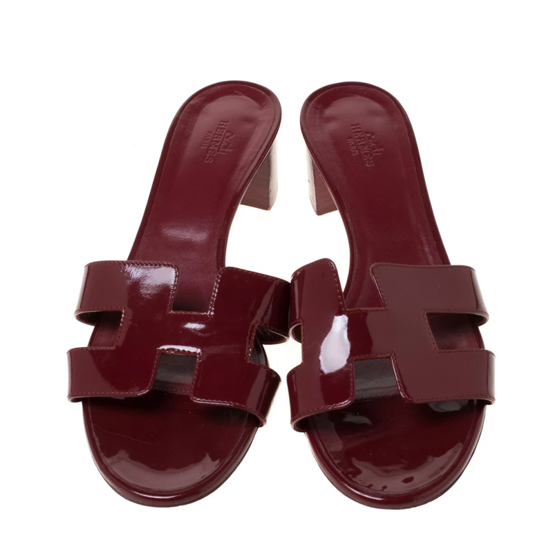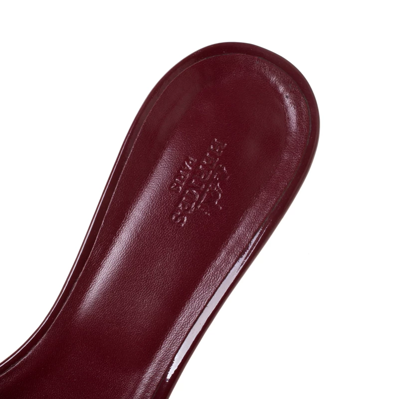 These burgundy slip-on sandals from Hermes are a pair of simple and casual shoes. These slides have H shaped across the toes straps that are made from patent leather. It is finished with open toes and low block heels. The insoles are lined with matching leather that feature Hermes labels.