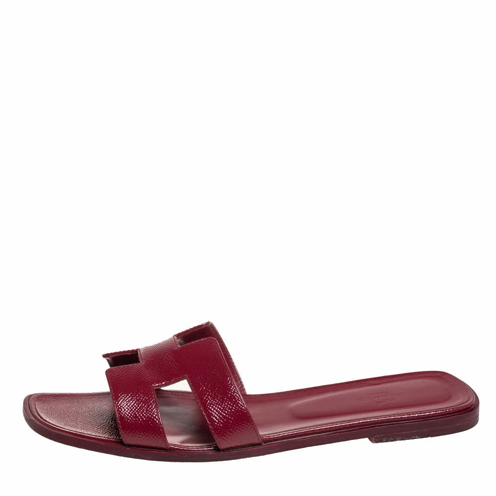 Put your best foot forward this season in these pretty Hermes sandals. These burgundy Oran sandals have been crafted from patent leather in Italy and they feature the iconic H on the vamps as well as insoles meant to provide comfort at every step. These sandals are sure to attract admirers!