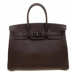 Hermes Birkin was inspired by Jane Birkin and is one of the most desired handbags in the world. A timeless classic that never goes out of style. Handcrafted from the highest quality of leather by skilled artisans, it takes over 18 hours of rigorous effort to stitch a Birkin together. Crafted in France from Cacao Togo leather, the bag features dual top rolled leather handles, a padlock, keys and a clochette. The bag comes with palladium hardware and has a spacious leather lined interior. Birkin 35 can hold all your daily necessities and more. High quality and flawless craftsmanship are synonymous with Hermes. Invest in this collectible as it retains its value year after year.