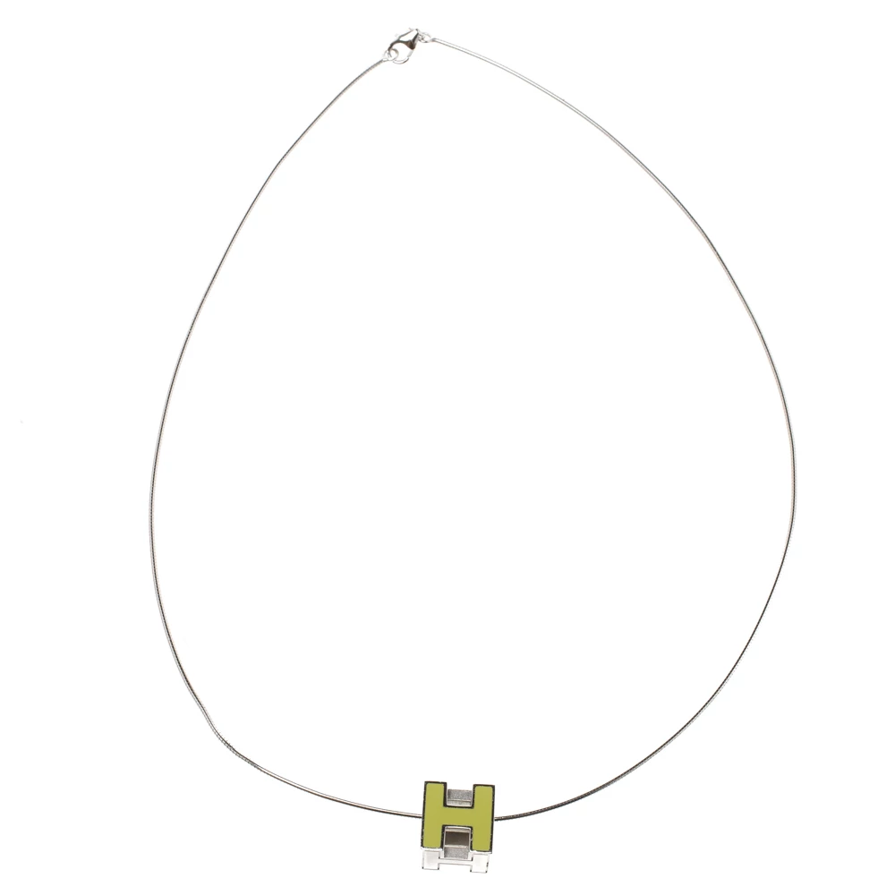 Wear it with your everyday casuals or dress it up with your day time party looks, this beautiful Hermes Cage d’H pendant necklace is sure to stand out. Constructed in palladium plated metal, this necklace features a roped chain along with woven three squared H shaped pendant which is further enhanced with lime green enamel coating to complete the look.