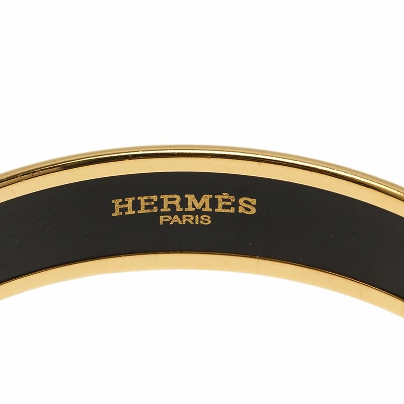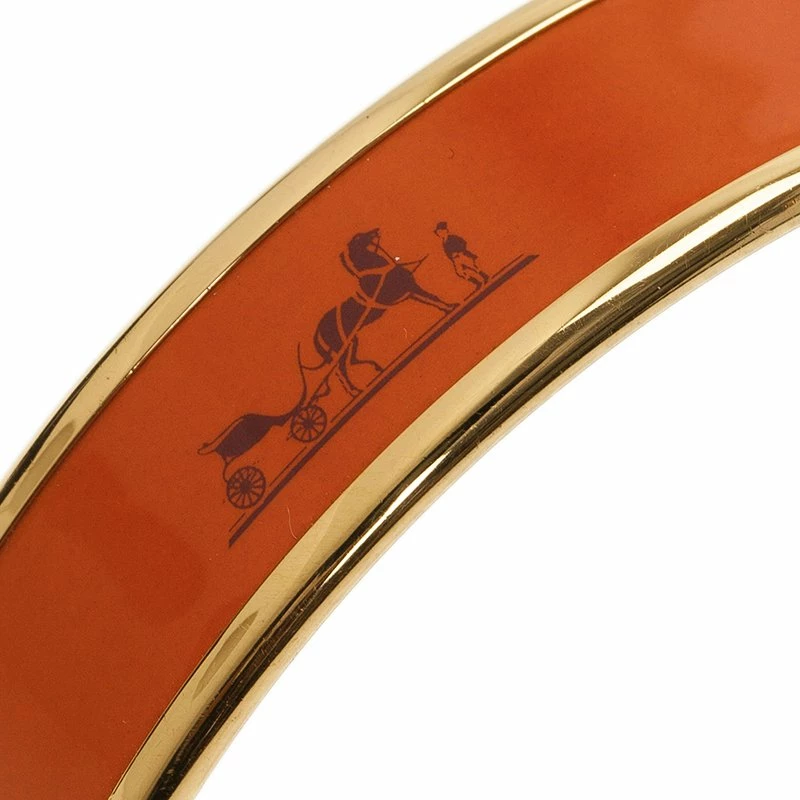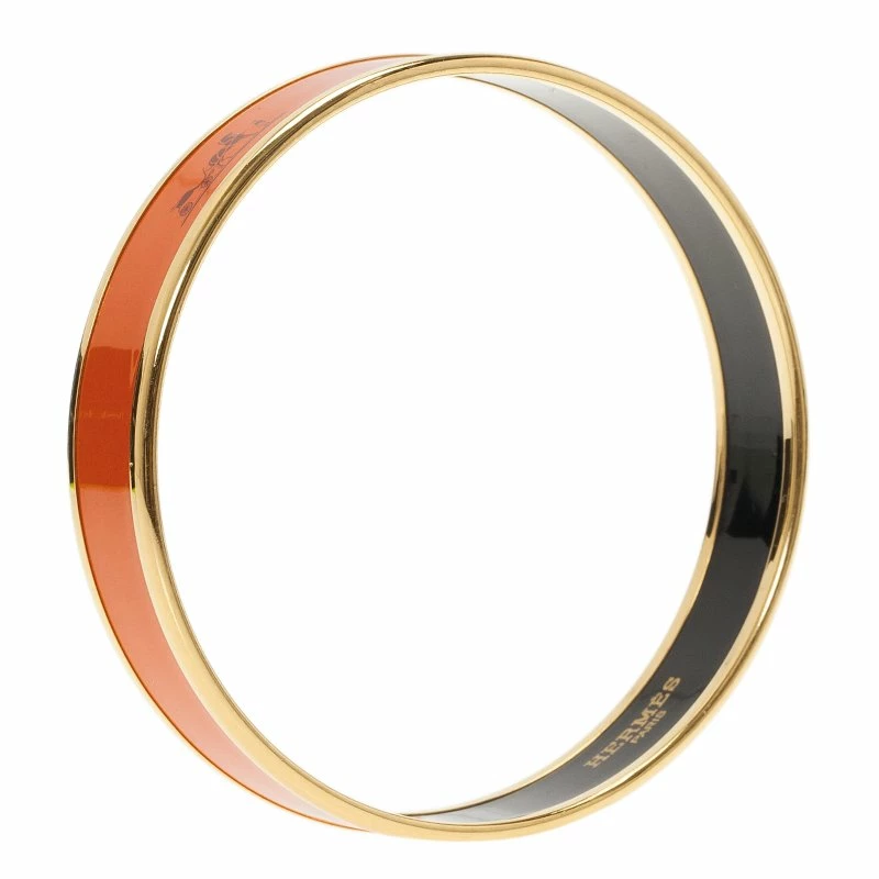 Jazz up your attire with this signature bracelet by Hermes. Printed with an Hermes logo, its combination of bright shade of orange and gold will add a metallic shine look to your outfit.