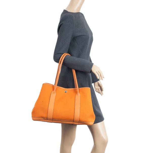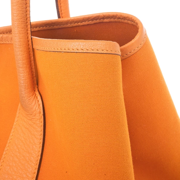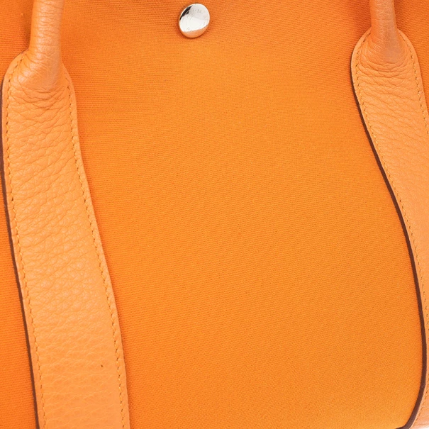 This Hermes Canvas Leather Tote is part of the elegant Garden Party collection. Crafted from orange canvas and lined with an orange leather trim, this bag is fun and practical. It features double rolled top handles, monogrammed stud closure in silver-tone hardware and additional studs on its sides to adjust the width of the bag. Its spacious interior is lined with orange canvas and has a leather base.Original Retail Price: US $2,025
