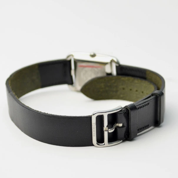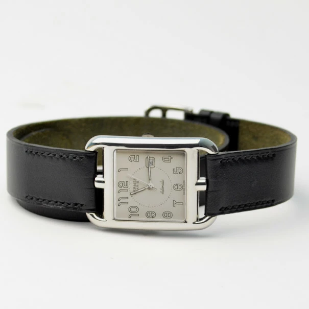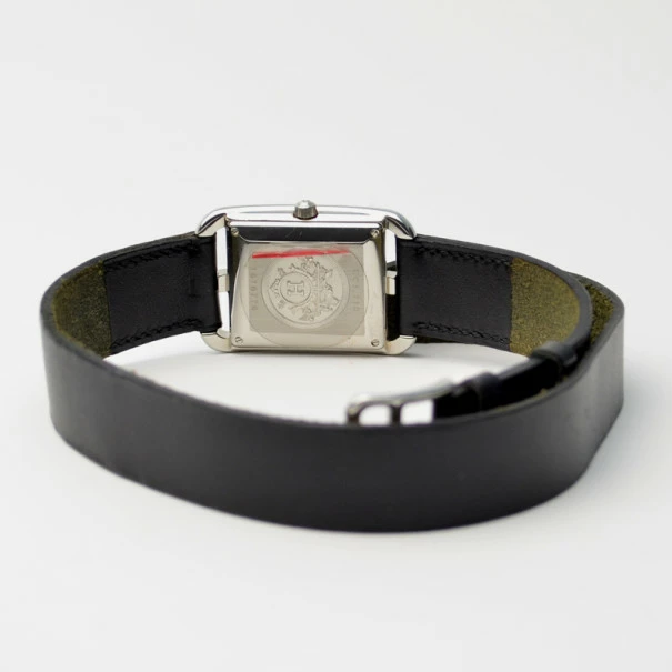 This Hermes Cape Code SS Ladies Watch is smart and stylish. The square white dial features emphasized English numerals, white and black hands and a small date window. This fully automatic water resistant watch features a smooth black leather strap that fixes on the wrist with a buckle closure mechanism. Team it up with a black suit or funky denims!Gender: LadiesOriginal Retail Price: USD $2,395Condition: NewCase Size: 30 MMBand Material: LeatherBand Size: 42 CMMovement: QuartzCase Material: Stainless SteelIncludes: Original Box