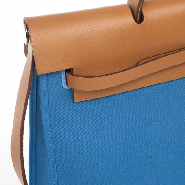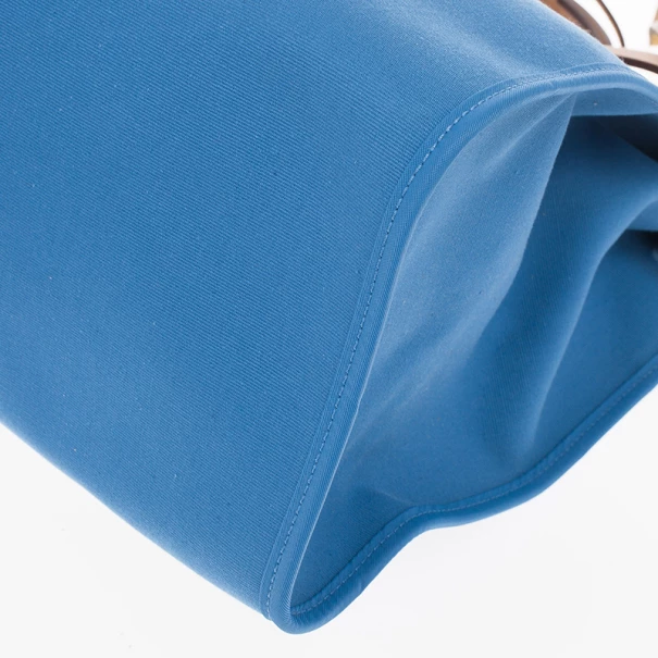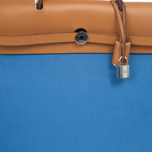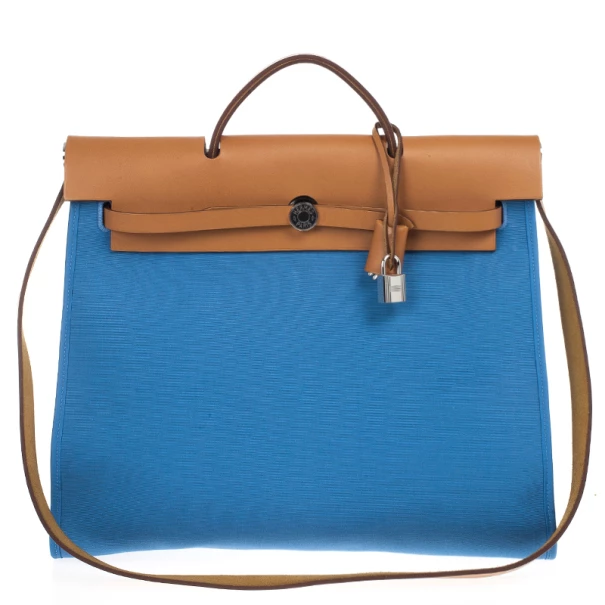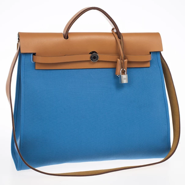 Instantly becoming a must-have, the Hermes Herbag collection rose to the top. In a celeste blue hue, this tote has a calming and welcoming color that can be paired with a simple jeans and a shirt. Its spacious canvas interior is protected with a flap that holds a strap closure secured by monogrammed hardware. The handles and shoulder strap are made from brown leather, matching the flap closure. This bag features a key and lock, in addition to an internal pochette with a zip closure and a leather tab.Original Retail Price: US $2,450