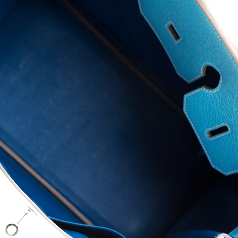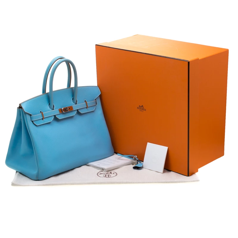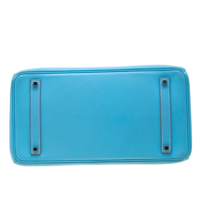 A bag that has become a hallmark of luxury and class, the Birkin from Hermes is one of the most coveted bags in the world. Custom-made on the suggestions of Jane Birkin, hence the namesake, this bag is aimed to fit the wants of the fast-paced life of modern women. Timeless design coupled with rich craftsmanship, the structured body of this Birkin 35 bag is crafted from Epsom leather in a bright blue hue. Its foldover top is secured by palladium-plated turn-lock closure which is accompanied by a dangling key which is safe within a leather clochette. The interior of the bag has leather lining and is equipped with a zip pocket for storing little essentials. Complete with dual rolled handles and studs at the bottom, this bag is an investment that will last you for years.