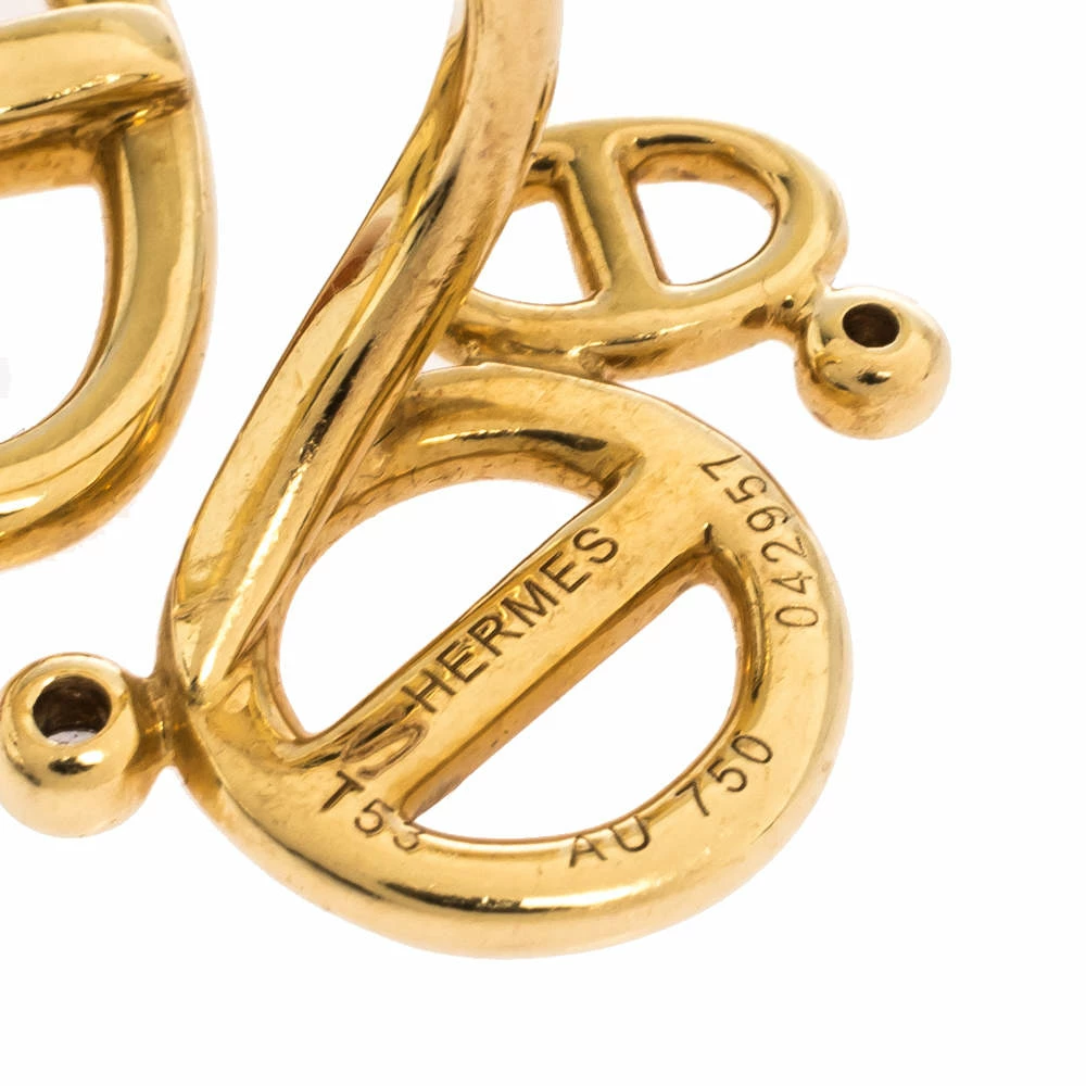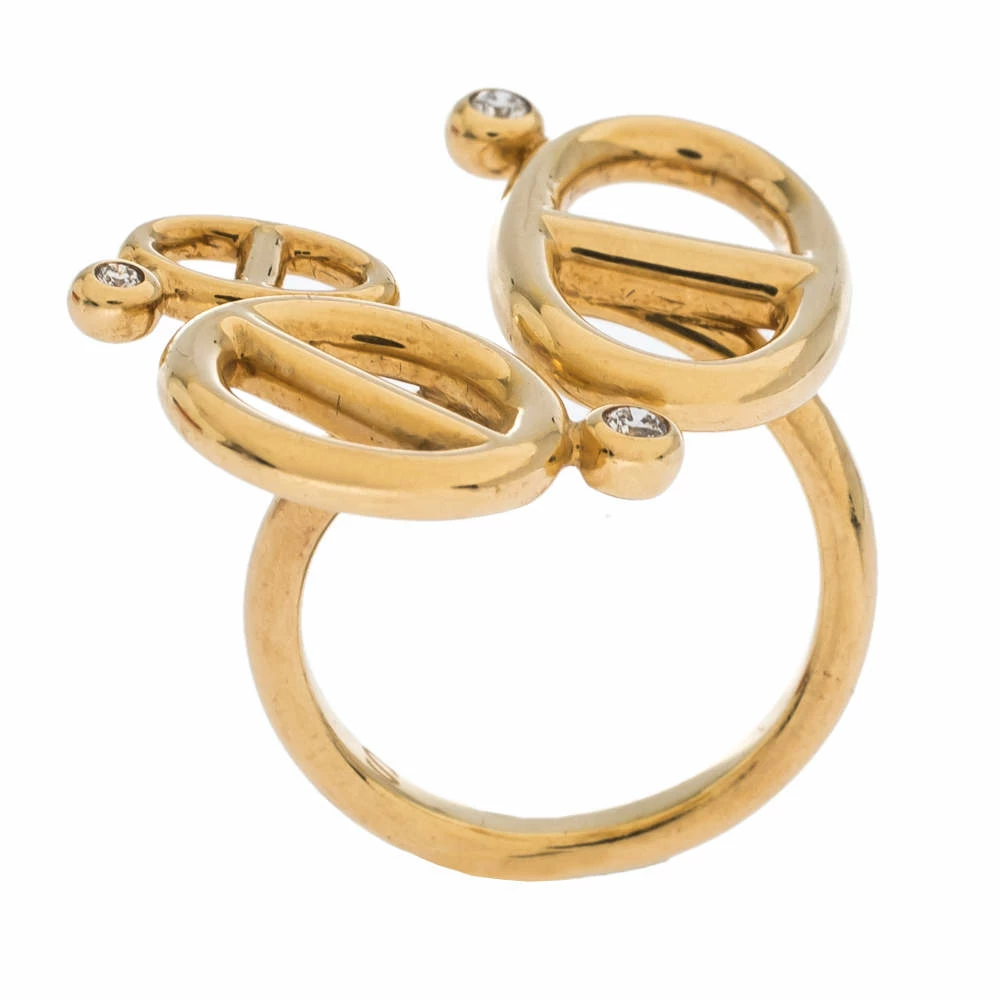 This elegant design of the Chaine d’Ancre ring is inspired by the ship anchor chain and has a refined look that will go with any dress or look. This creation features an open silhouette with three links of a chain stationed smartly and each motif is beautifully accompanied a shiny diamond. It is rendered in 18k yellow gold and can be worn with ease.