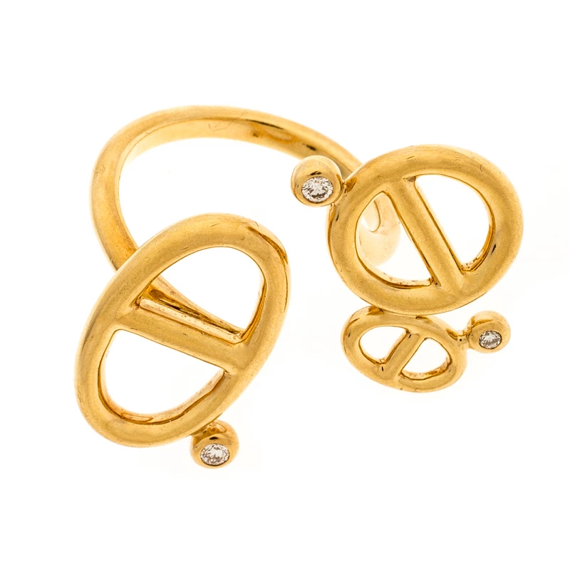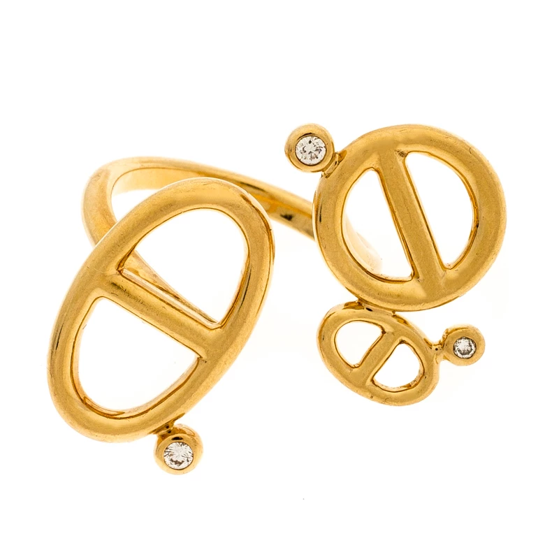 This elegant design of the Chaine d’Ancre ring is inspired by the ship anchor chain and has a refined look that will go with any dress or look. This creation features an open silhouette with three links of a chain stationed smartly and each motif is beautifully accompanied shiny diamond. It is rendered in 18k yellow gold and can be worn with ease.