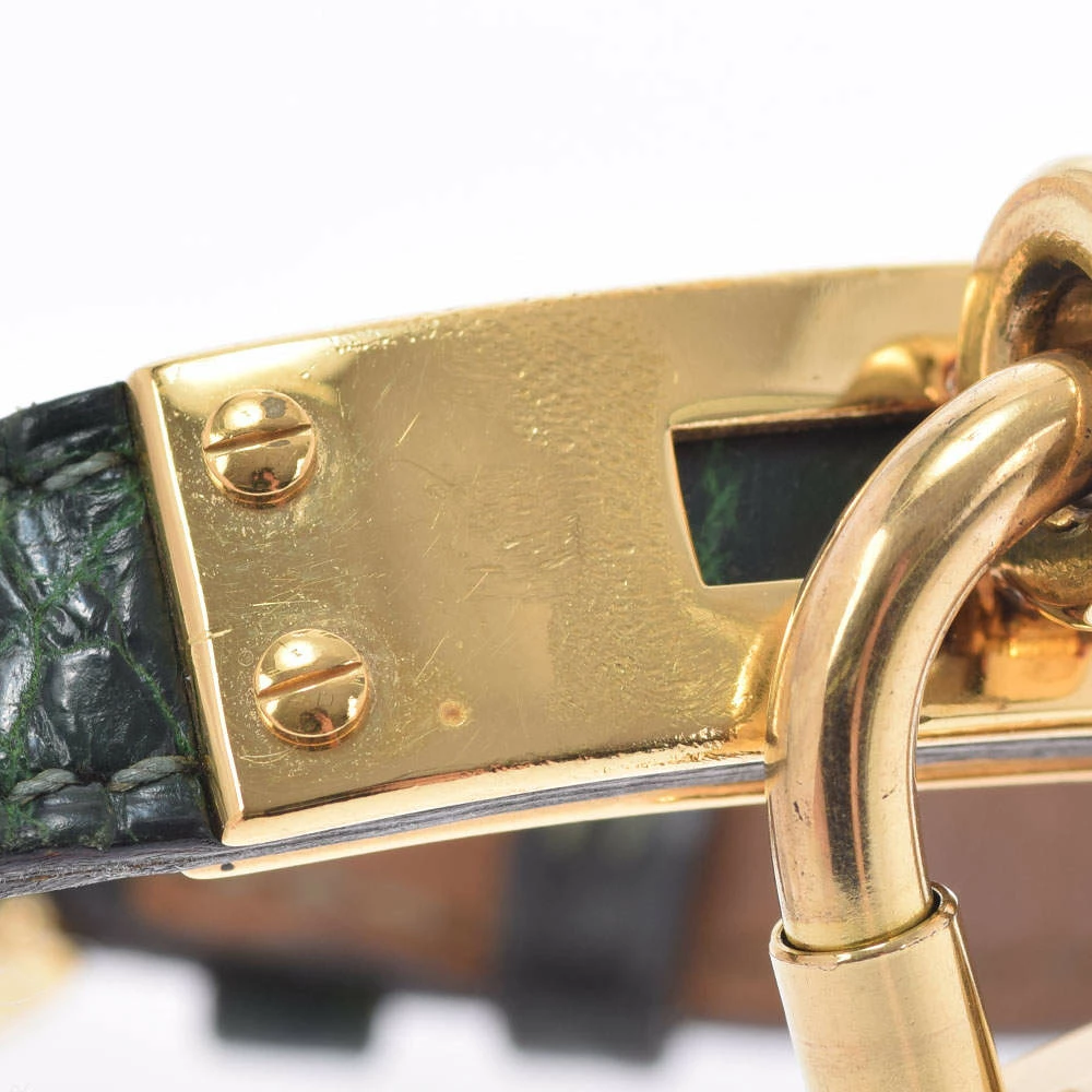 Hermes brings this unique wrist watch that is designed to resemble a lock dangling off a black leather strap. The yellow gold lock case has a matching bezel and encases a champagne gold dial which features raised dot indices as hour markers and sleek gold hands.