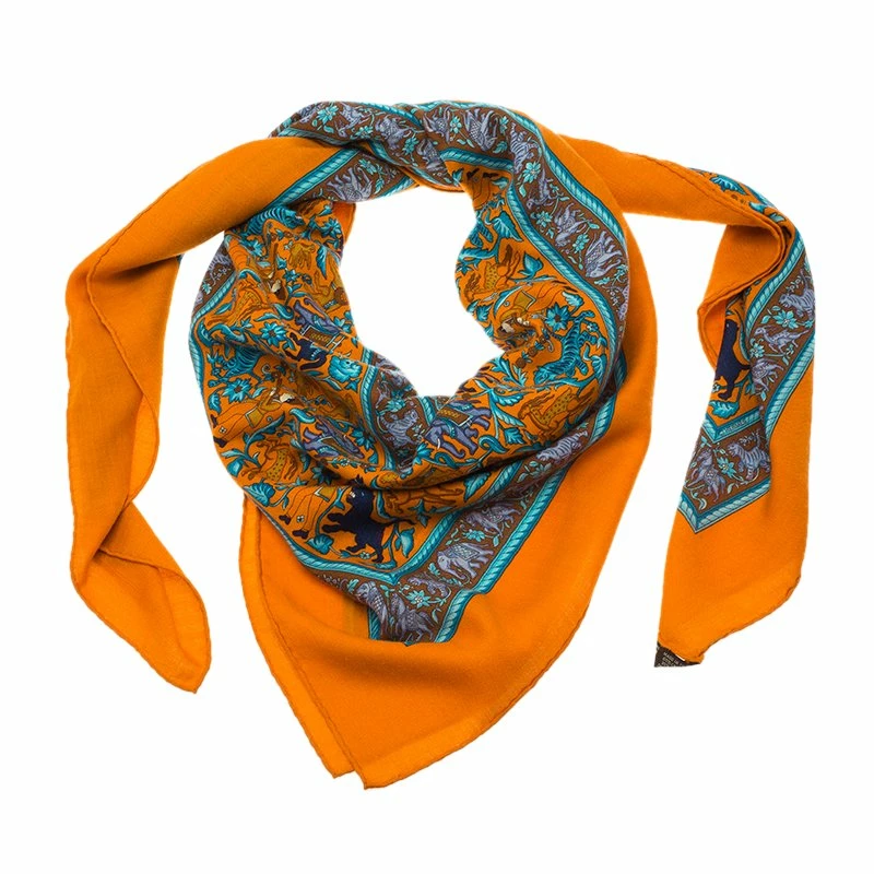 A cashmere shawl is a favourite accessory of an elegant woman and this shawl is no exception. Full of vibrance, warmth and animal and floral motifs, this orange beauty is a delightful accessory to battle against the cold weather in style.