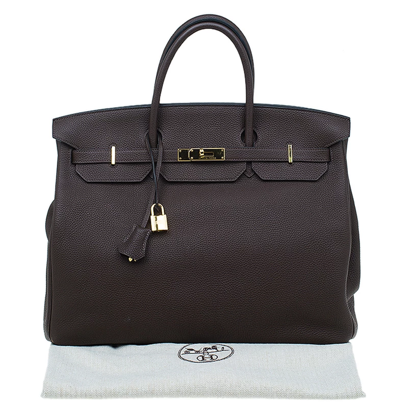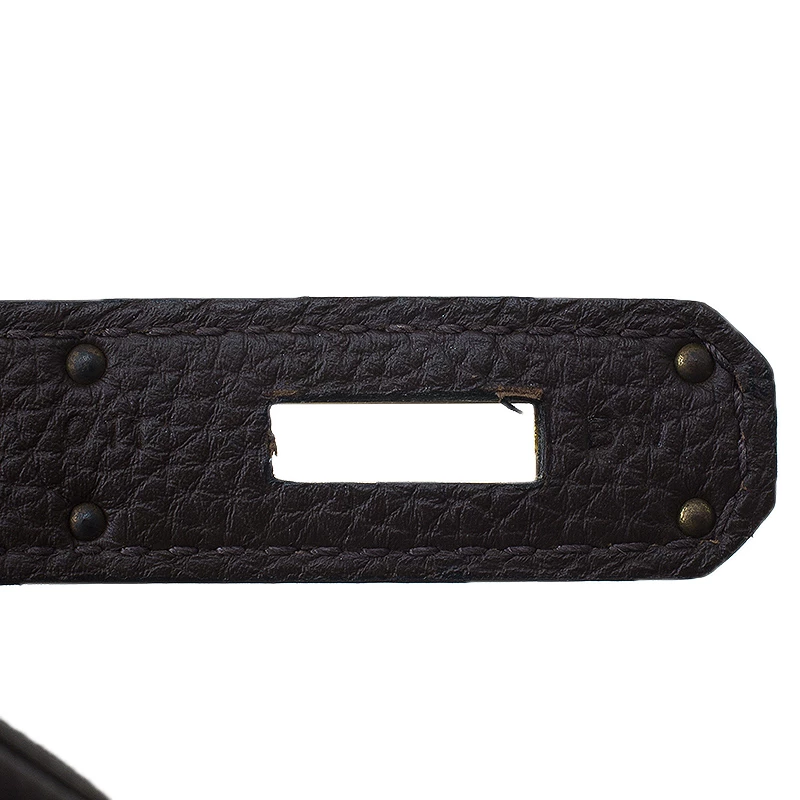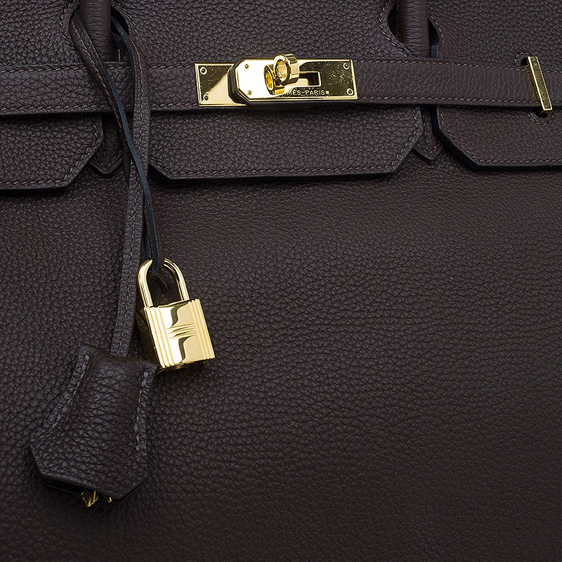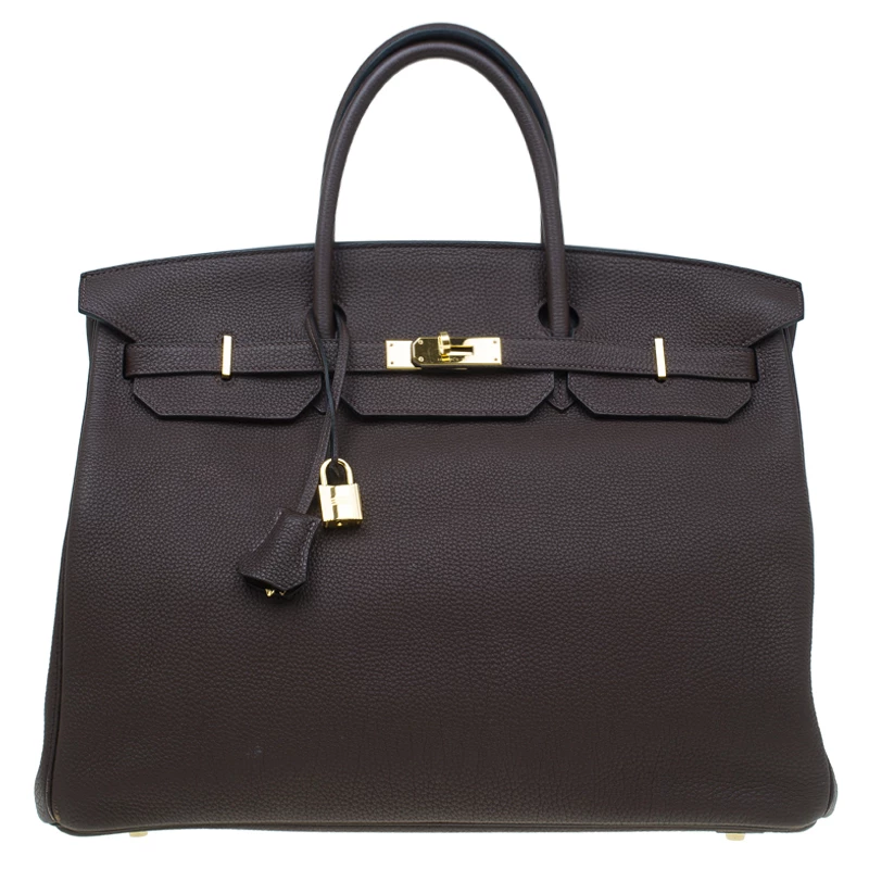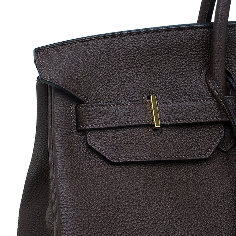 This timeless classic Birkin by Hermes is crafted from supple brown Togo leather. The exquisite exterior is detailed with a signature belt and twist lock closure, leather clochette, double handles, polished gold-tone key, and lock. The bottom comes secured with studs. A roomy leather lined interior has a zipper pocket and two patch pockets.
