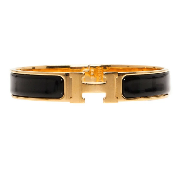 The iconic Hermes Clic Clac H bracelet made a splash on the fashion scene. This beauty is designed with black enamel and gold-plated palladium, and features an “H” hook closure.Original Retail Price: US $670