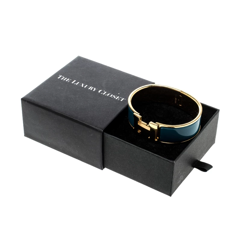 This simply elegant ‘Clic Clac H’ bracelet from the house of Hermes is designed in a wide silhouette. It features a gold-plated body with blue enamel on it and the iconic ‘H’ logo at the centre. Wear it with your favourite watch or as an independent piece.