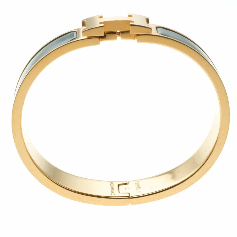 Adorn your wrist with this stunner of a bracelet from Hermes. The piece is from their Clic Clac H collection and it has been crafted from gold-plated metal and designed with blue enamel. This bracelet is complete with the iconic H.