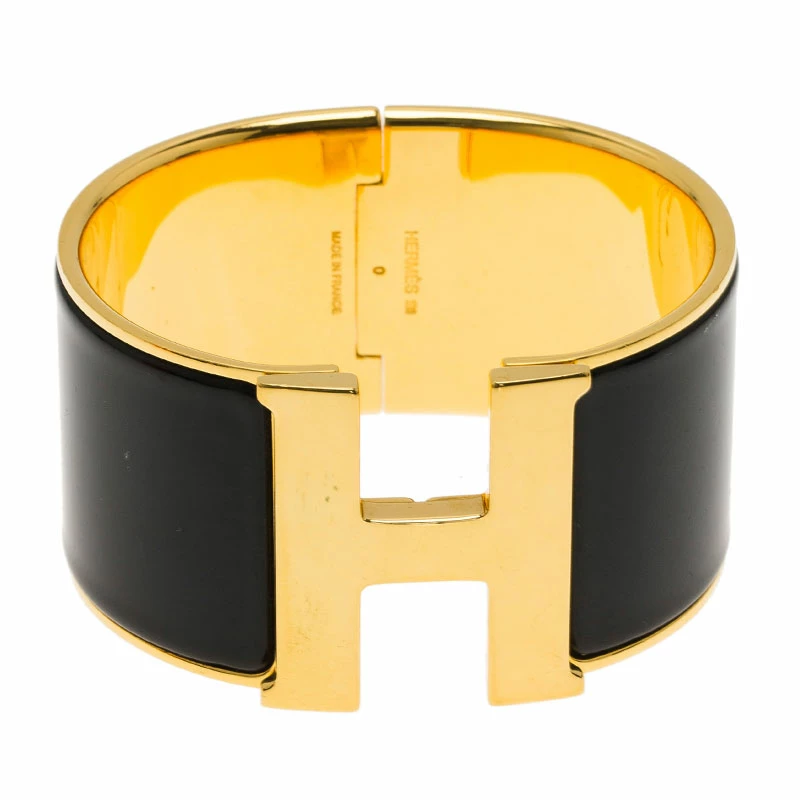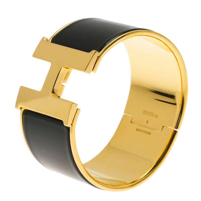 This Hermes black enamel wide bracelet will have all eyes on it. This bracelet is made with gold-plated metal with a black enamel top. The signature Hermes ‘H’ logo at the front adds style to its clic clac design. It will definitely style up any outfit in your closet.