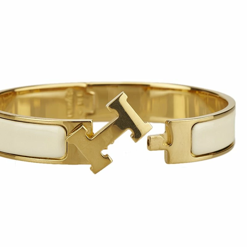 The iconic Hermes Clic Clac H bracelet made a splash on the fashion scene. This beauty is designed with cream enamel and gold-plated palladium, and features an “H” hook closure. Never be out of style and be sure to turn heads everywhere you go.
