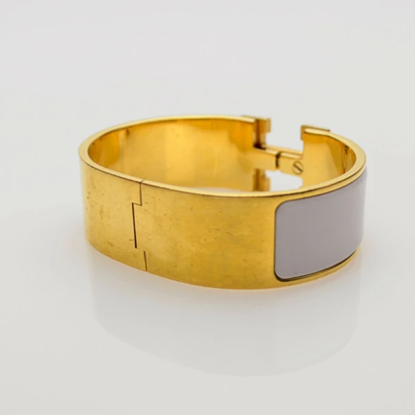 This appealing Hermes bangle is the ideal summer accessory. The wrist-let quality gold plated metal is uniquely designed with a light purple color and the Hermes “H” charm decorating the lock. Get those compliments you longed for as you pair it with your everyday outfits!Original Retail Price: US $630