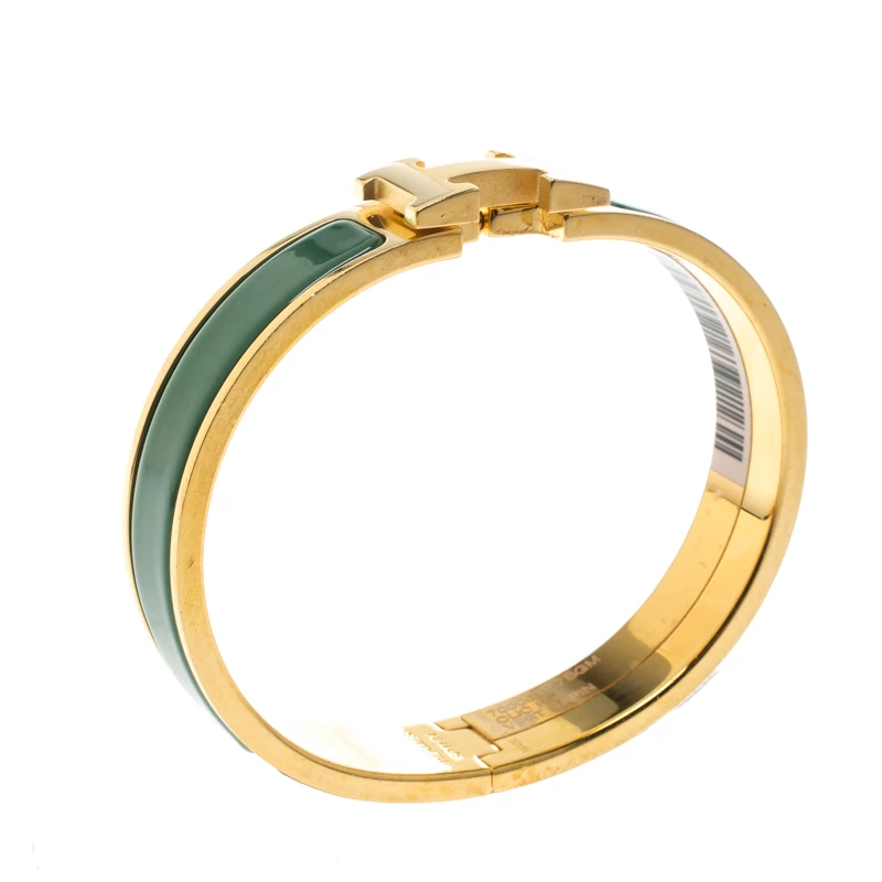 One of the most popular designs from Hermes when it comes to accessories is the Clic Clac. The Clic Clac H collection is a hit amongst fashionable women and it’s time you have one yourself. This piece has been crafted from gold-plated metal and designed with green enamel and made complete with a swivel H.