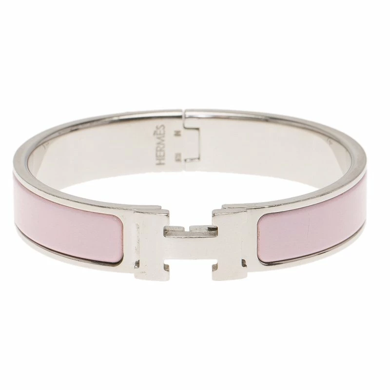 This bracelet embodies Hermes’ elegant craftsmanship with its palladium-plated metal body coated with pink enamel. Featuring the iconic H logo of the fashion house in silver-tone, this bracelet is a perfect accessory to look sophisticated in a formal or a casual outfit.