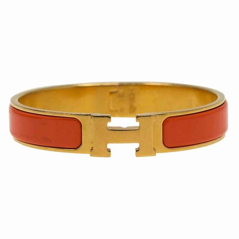 The iconic Hermes Clic-Clac H bracelet is a simple adornment with influential impact. This beauty is designed with orange enamel and gold-plated metal, and features an “H” hook closure. Classically elegant and easy to wear, this bracelet will give any outfit a pop of colour. The perfect gift for the woman of style in your life, or for yourself!