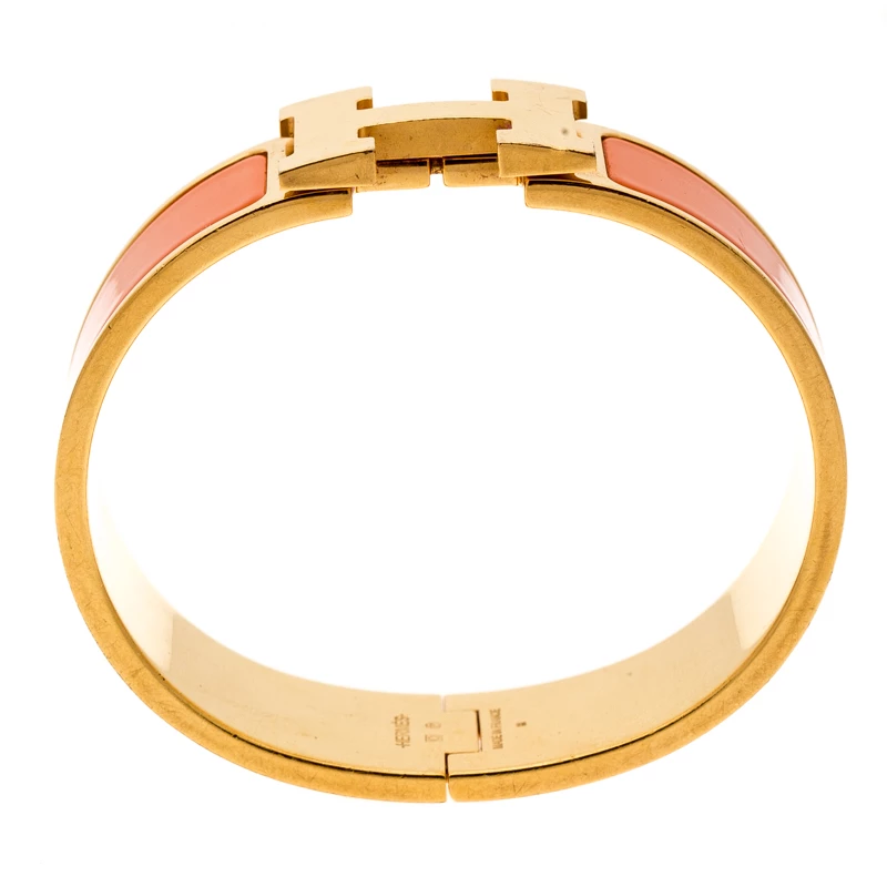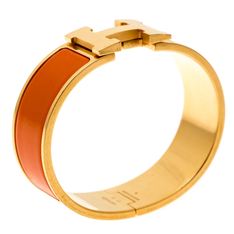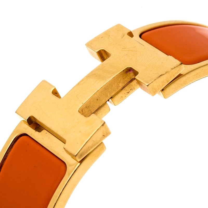 Ace the accessory game when you adorn your wrist with this stunner of a bracelet from Hermes. The piece is from their Clic Clac H collection and it has been crafted from gold-plated metal and designed with orange enamel. This bracelet is complete with the iconic H.