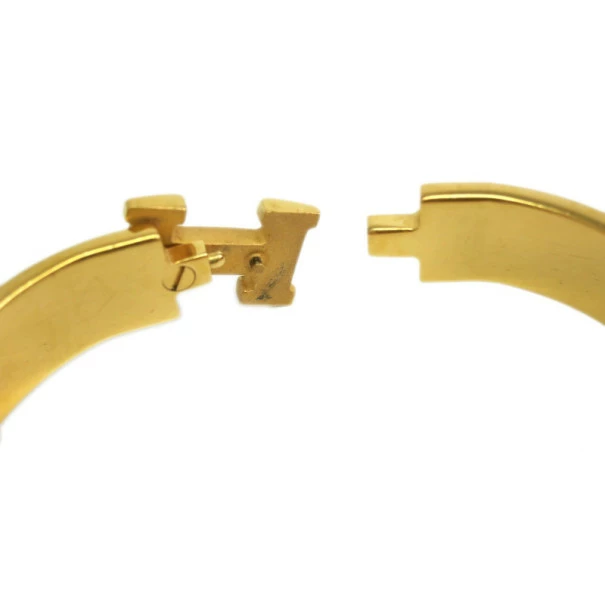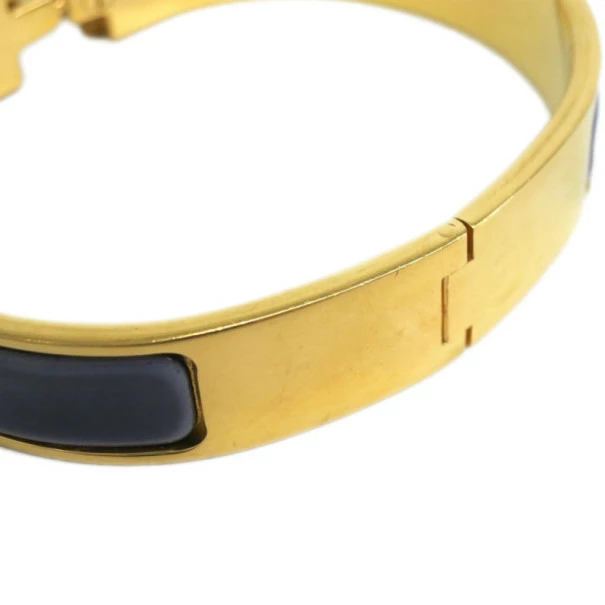 The iconic Hermes Clic Clac H bracelet made a splash on the fashion scene. This beauty is designed with dark purple enamel and gold-plated palladium, featuring an “H” hook closure.