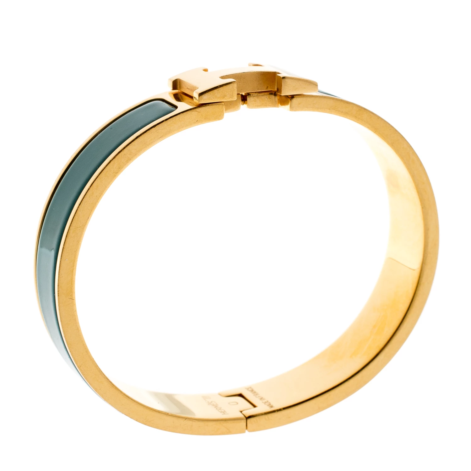 One of the most popular designs from Hermes when it comes to accessories is the Clic Clac. The Clic Clac H collection is a hit amongst fashionable women and it’s time you have one yourself. This piece has been crafted from gold-plated metal and designed with green enamel. It is complete with a swivel H at the centre.