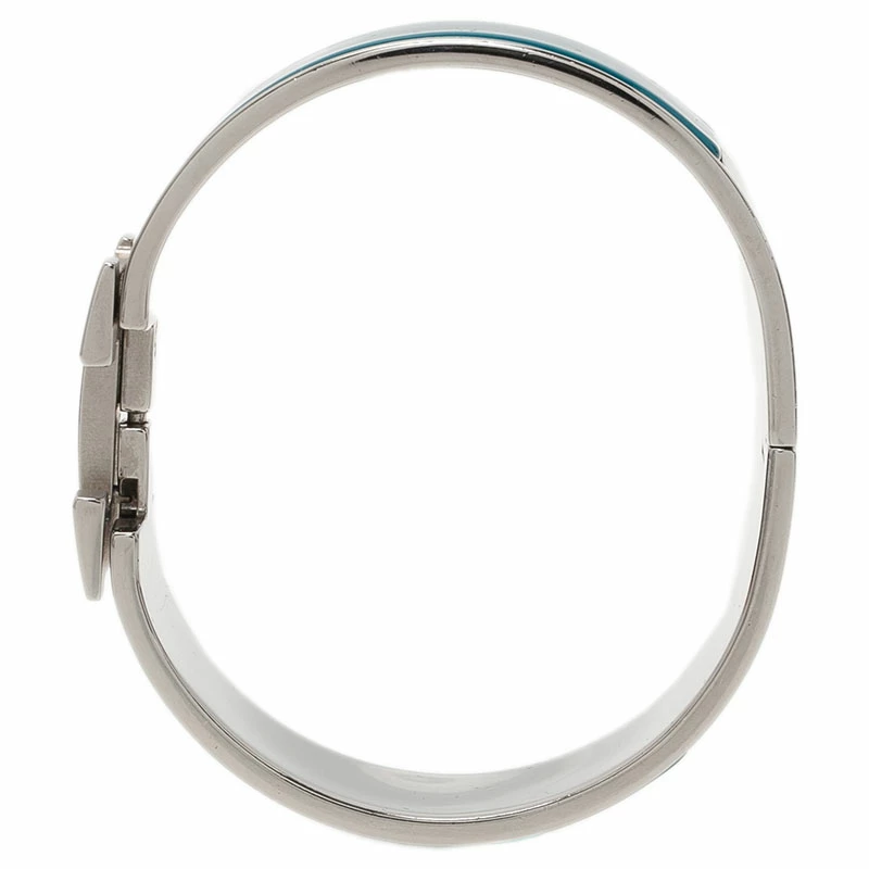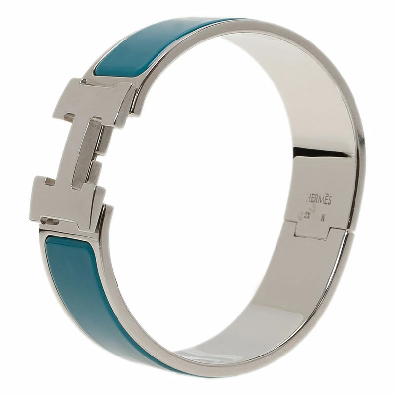 The iconic Hermes Clic Clac H bracelet made a splash on the fashion scene. This wide beauty is designed with blue enamel and palladium-plated metal, featuring an “H” hook closure.