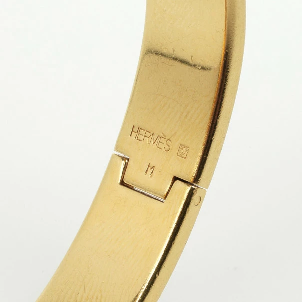 This Hermes bangle is a must have accessory. The bracelet is made from gold plated metal with a white enamel and the Hermes “H” charm decorating the lock. Get those compliments you longed for as you pair it with your everyday outfits!Original Retail Price: US $650