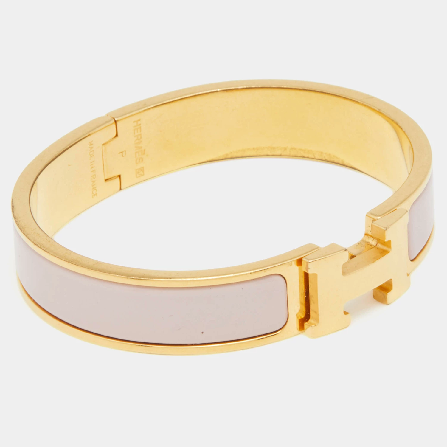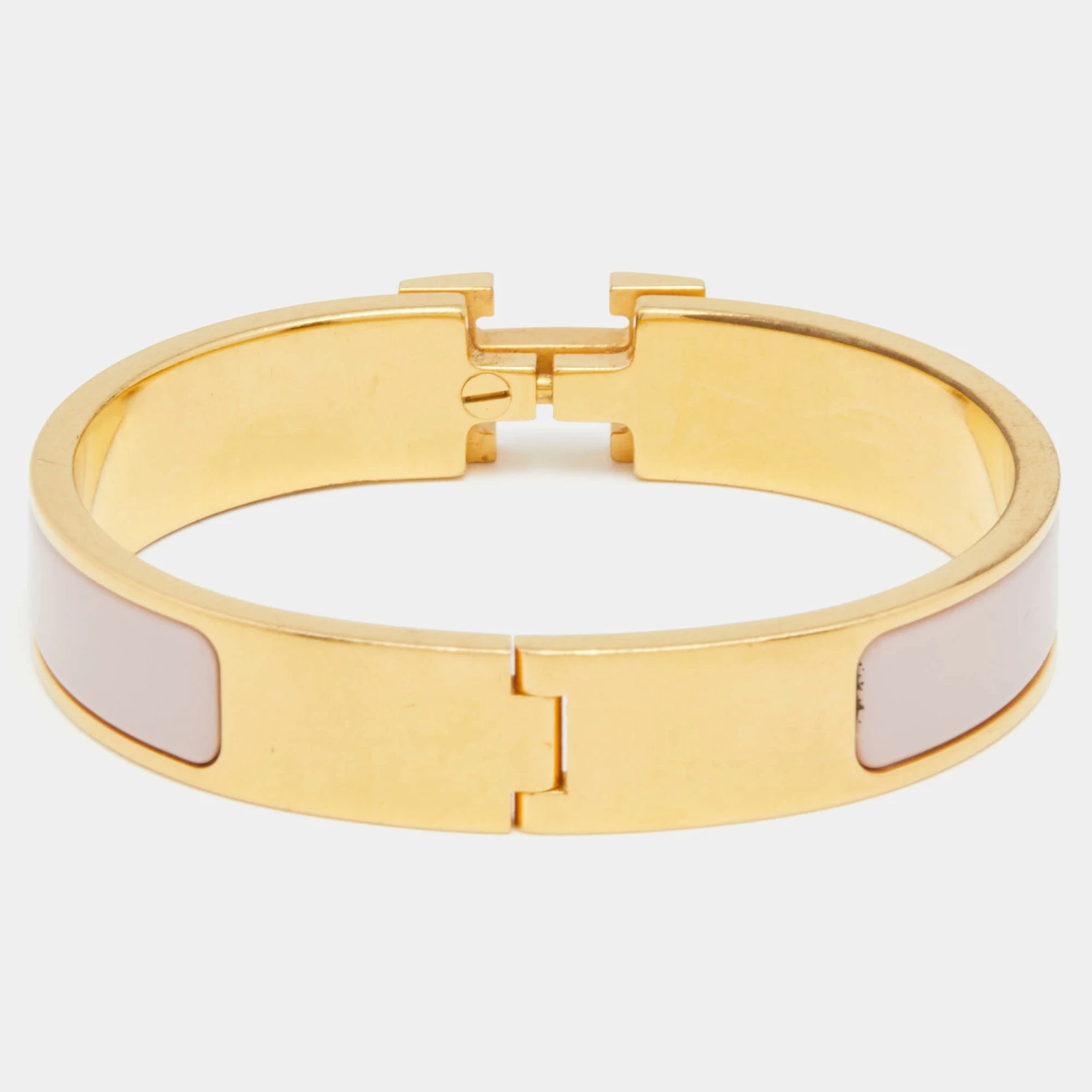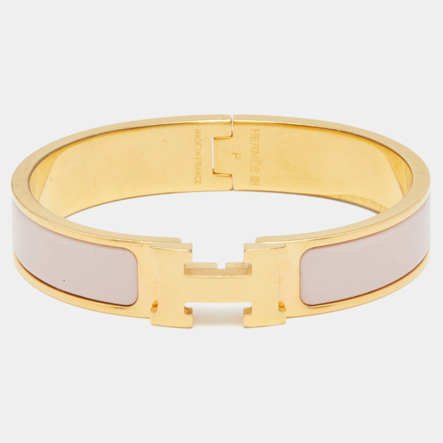 One of the most popular designs from Hermes when it comes to accessories is the Clic Clac H. The Clic Clac H collection is a hit amongst fashionable women and it’s time you have one yourself. This piece is crafted from gold-plated metal and designed with nude pink enamel and a swivel H.