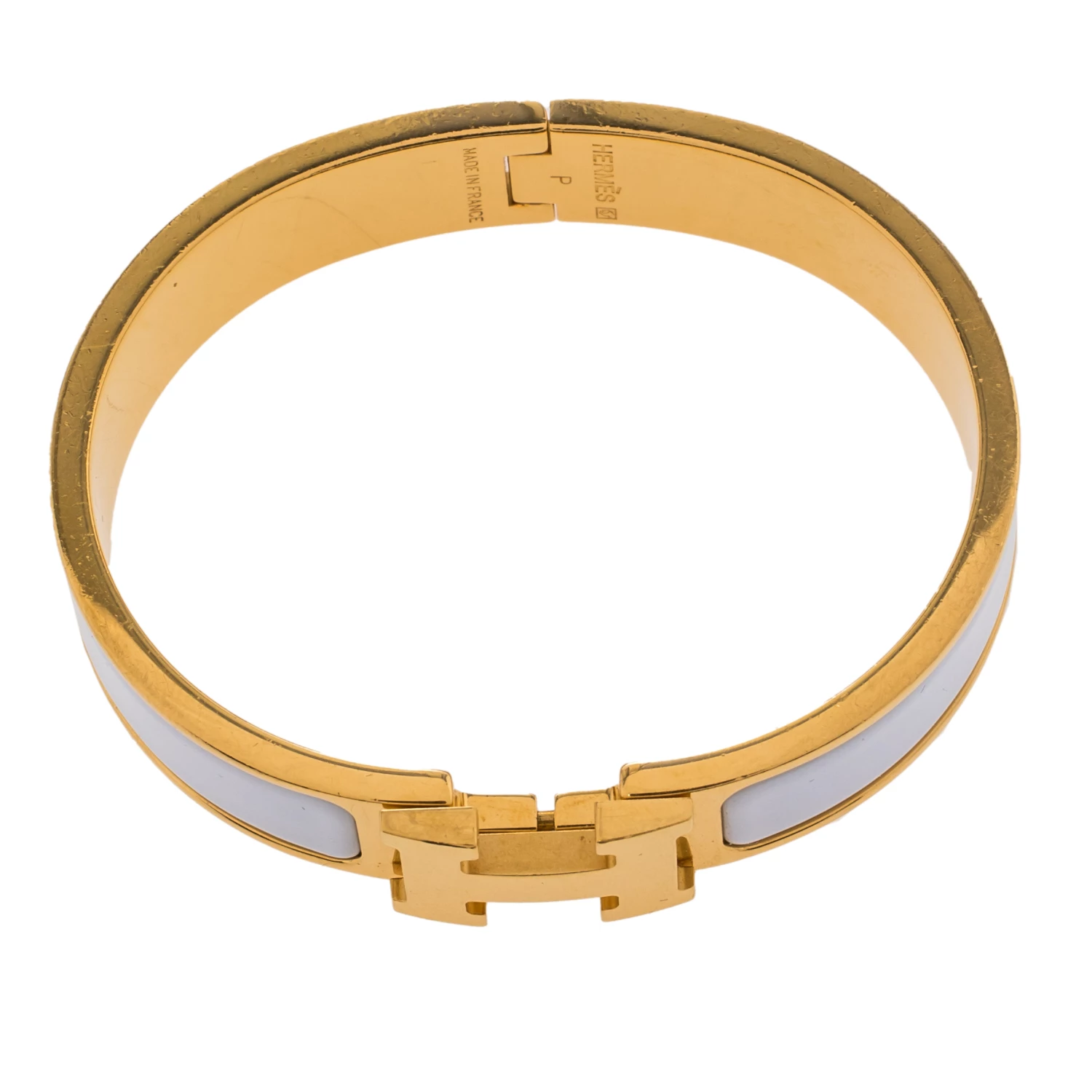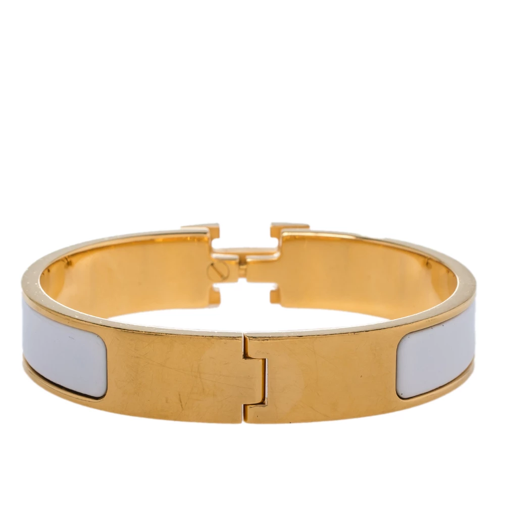 Adorn your wrist with this stunner of a bracelet from Hermes. The piece is from their Clic H collection, and it has been crafted from gold-plated metal and designed with white enamel. This bracelet is complete with the iconic H to the front. Get those compliments you longed for as you pair it with your everyday outfits!