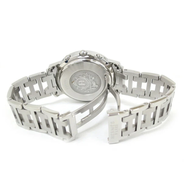 This Hermes Clipper Chronograph Mens Wristwatch is a blend of technical expertise and alluring design. The round blue dial is endowed with three white sub-dials, Arabic numerals, stick hands and a date window. The stainless steel case is proposed with an H link strap that fastens on the wrist with a deployment clasp closure. This 280g water resistant chronograph is sure to add another dimension to your persona.Gender: MenOriginal Retail Price: USD $3,600Condition: Like New (This watch has minor scratches on the bezel. It has been polished, tested for water resistance and furnished with a new battery)Case Size: 38 MMBand material: Stainless SteelBand Size: 18 CMMovement: QuartzCase material: Stainless SteelIncludes: International Warranty & Manual Book
