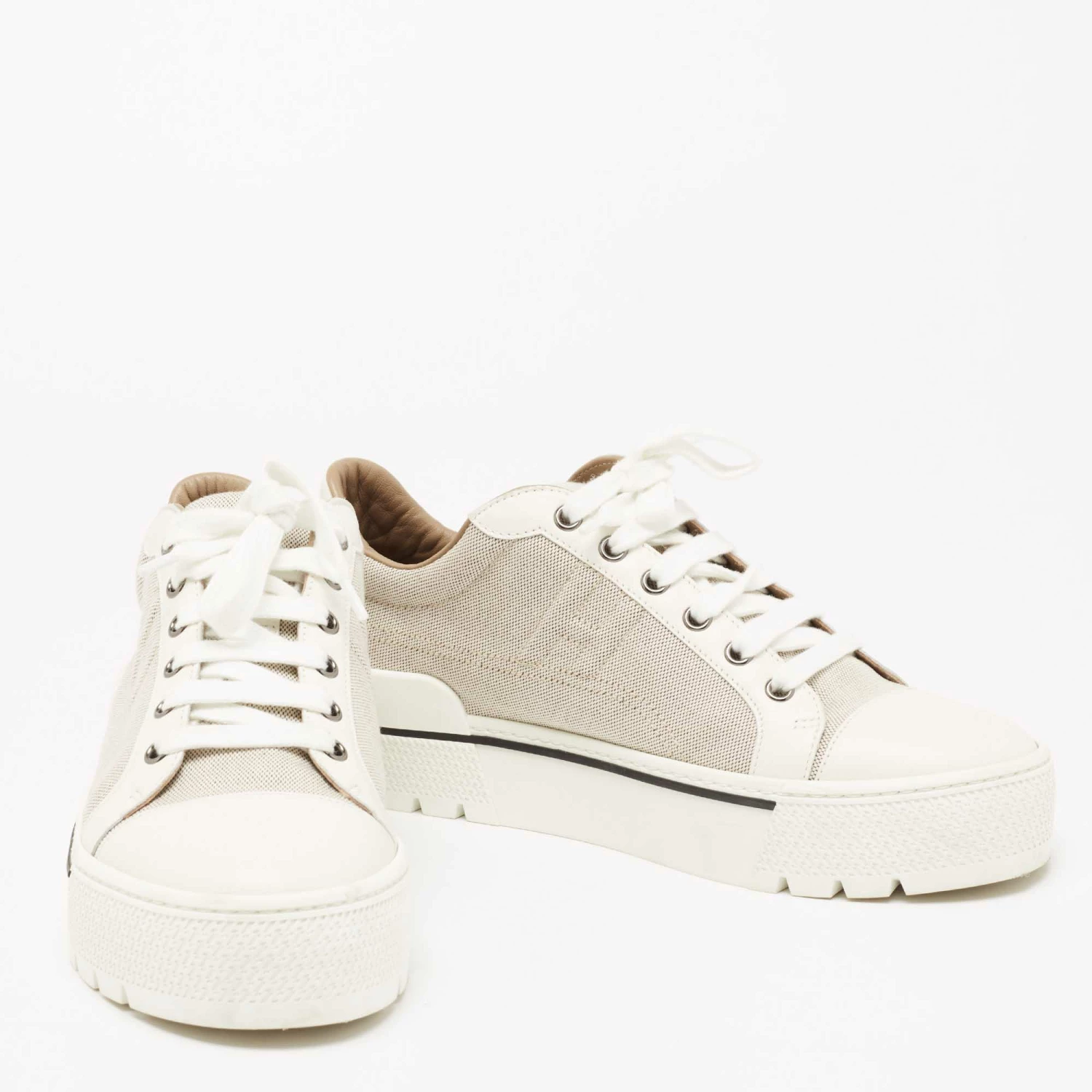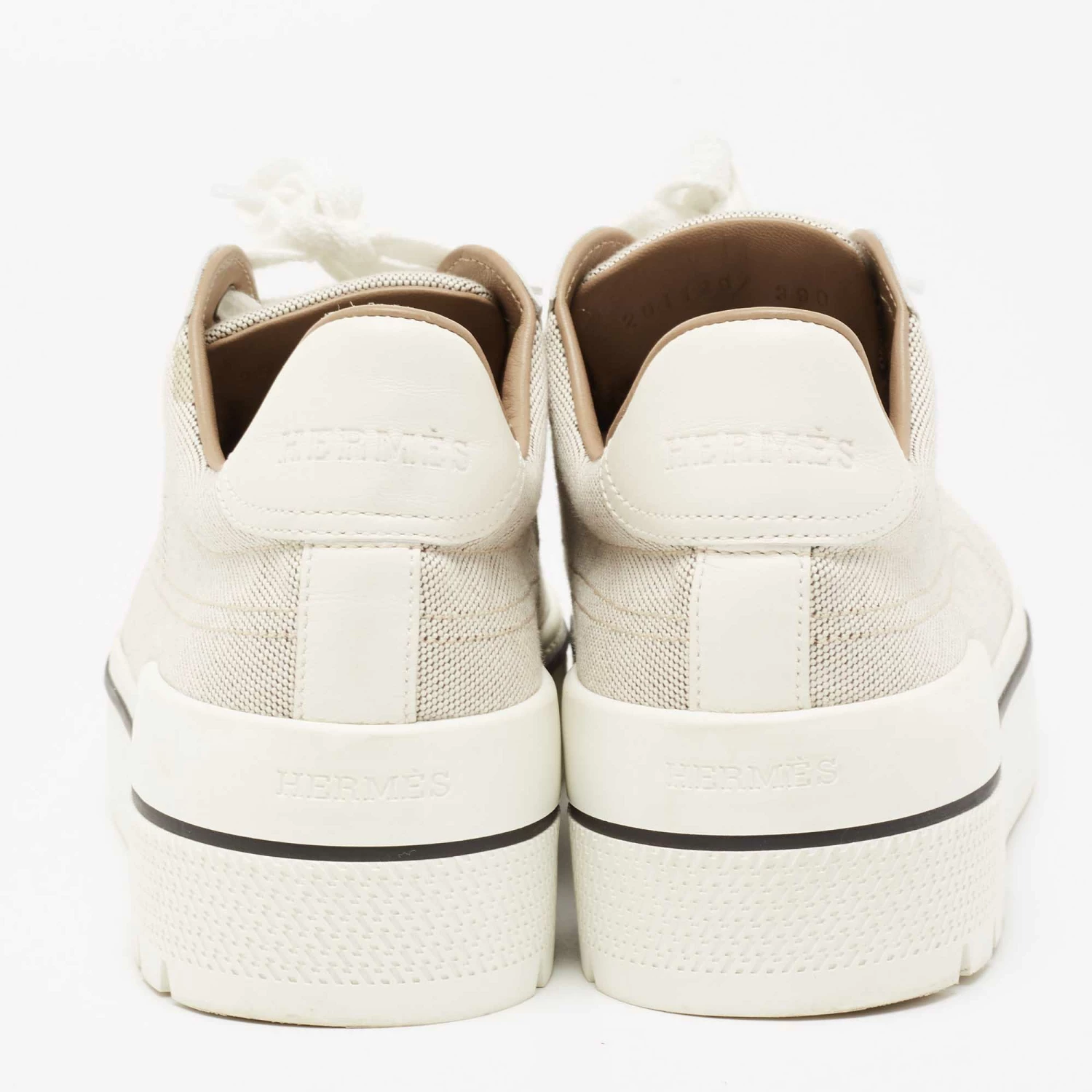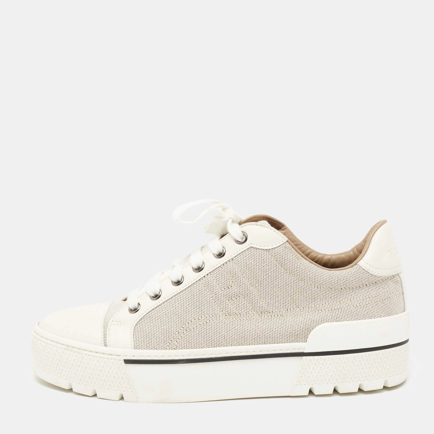 The sneakers by Hermes present a classic style in a modern tone. These are crafted in canvas and leather and detailed with the iconic H logo on the sides and a versatile cream hue. The sneakers are secured with lace-ups and equipped with rubber soles offering a good grip.