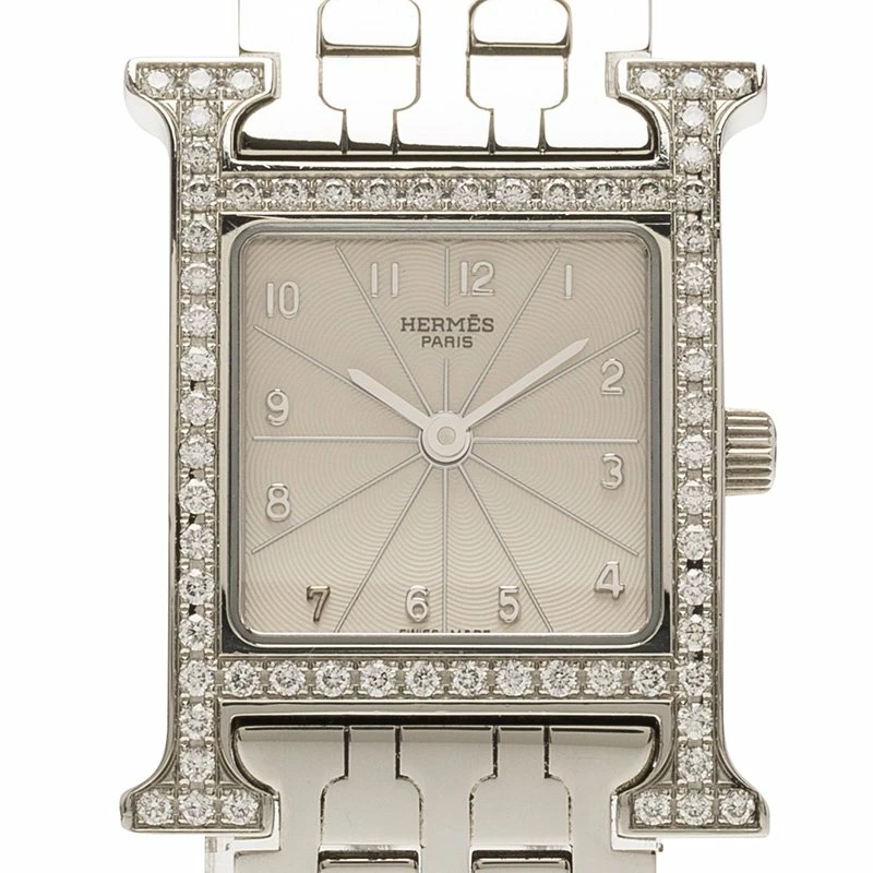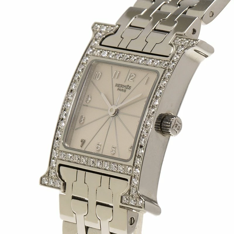 The iconic ‘H’ of Hermes is turned into a beautiful dial, an idea suggested by Philippe Mouquet in 1966. This classic wristwatch is neatly designed with a cream, sunburst patterned dial and paired with a bracelet type strap secured with a butterfly clasp closure. A perfect addition to any evening attire!