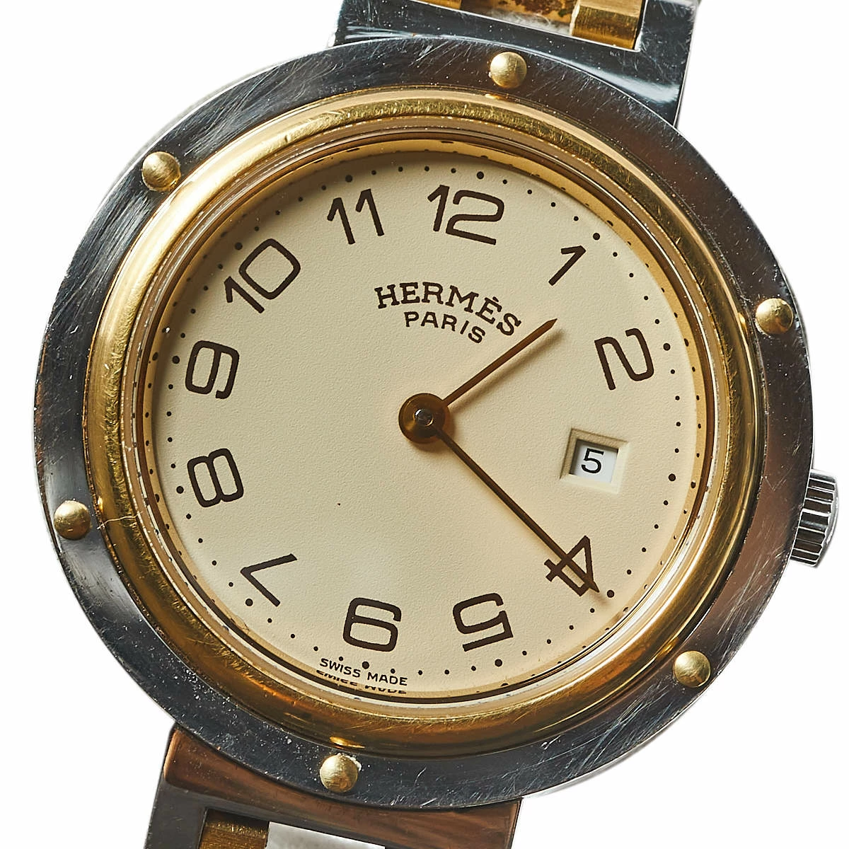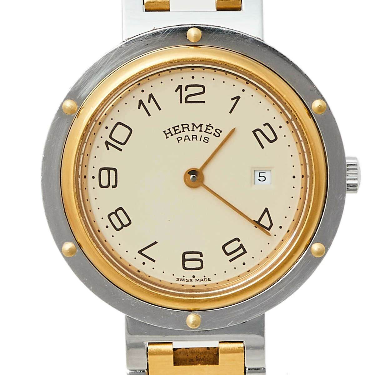 Designed with a modern aesthetic, this Clipper wristwatch from Hermes is sophisticated and slick. Made from two-tone stainless steel, the bezel is punctuated with studs. It features a round dial fitted with Arabic numeral hour markers, two stick hands, and a date window at the three o’clock position. The link bracelet is accented by signature H links. This 30 meters water-resistant, quartz watch has an engraved clasp closure.