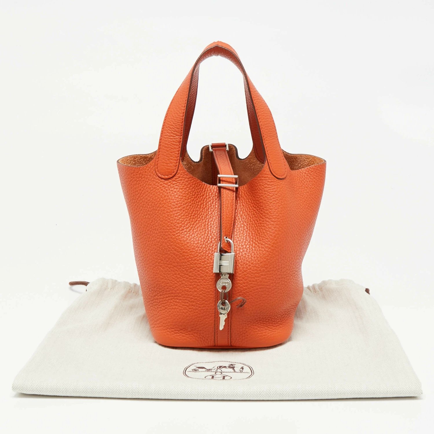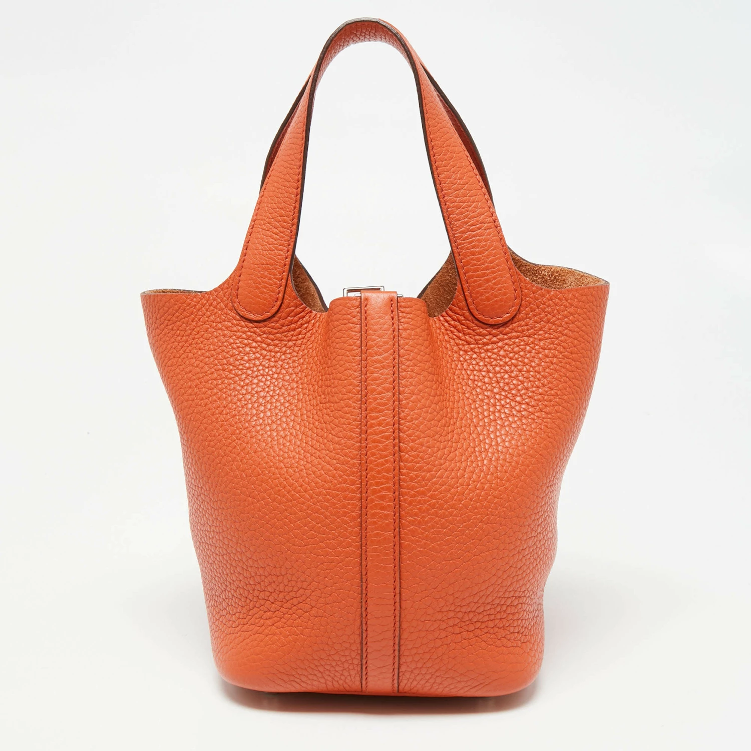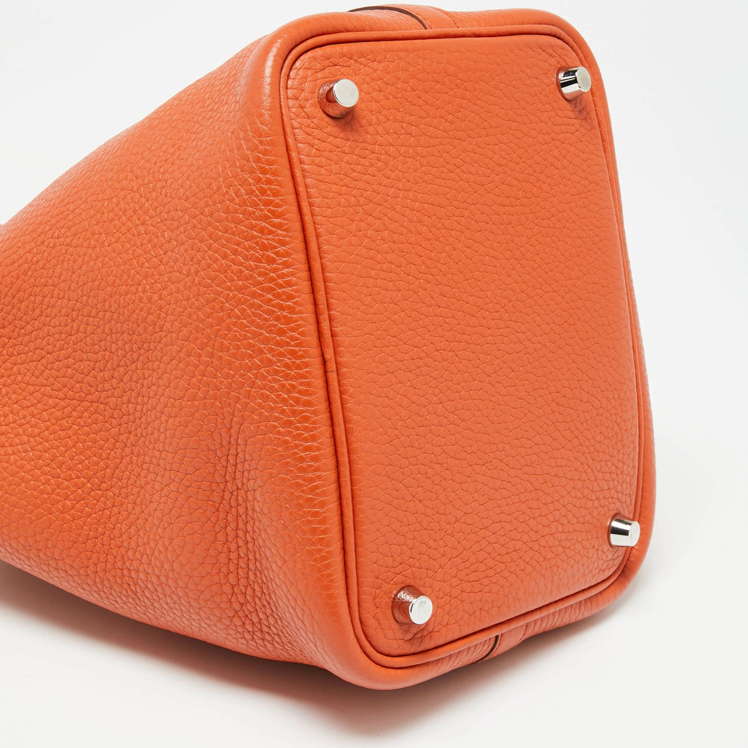 Wonderfully crafted from Clemence leather, this Hermes Picotin Lock 18 is a creation for those who love a blend of luxury and style. It comes in a grand color and it sits in a bucket-like shape with two handles and a leather interior. Armed with protective metal feet as a finishing touch, this pre-owned Picotin will be a sweet style companion.
