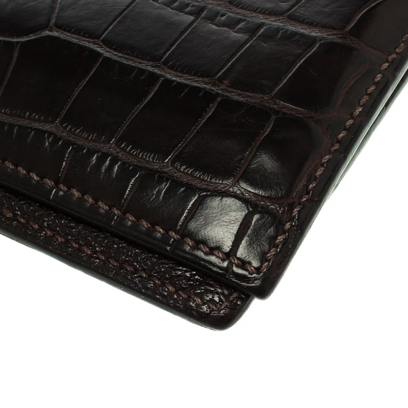 This dapper bi-fold wallet from Hermes is crafted from exotic brown leather. The interior that is leather lined has multiple card slots and a currency compartment. This investment piece is sleek in style and can easily fit inside your laptop bag.