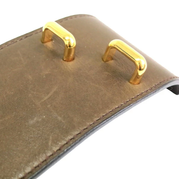 Pair this chunky Hermes bangle with your casual outfits. Made from leather, it comes with a tab closure with gold tone detailing. Gender: WomenOriginal Retail Price: US $600Condition: Gently Used (This bracelet has dull scratches and discoloration)Material: Metal, LeatherDimensions: 5 CM (W)Wrist Size: 15 CMIncludes: The Luxury Closet Packaging