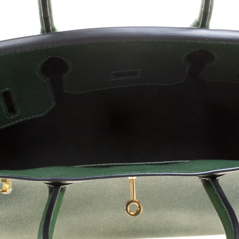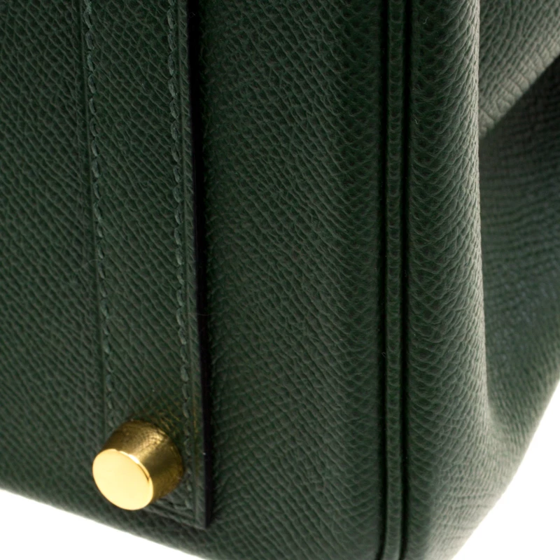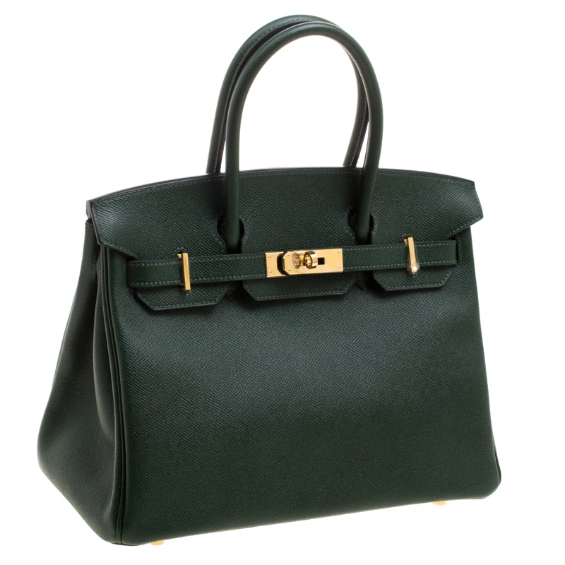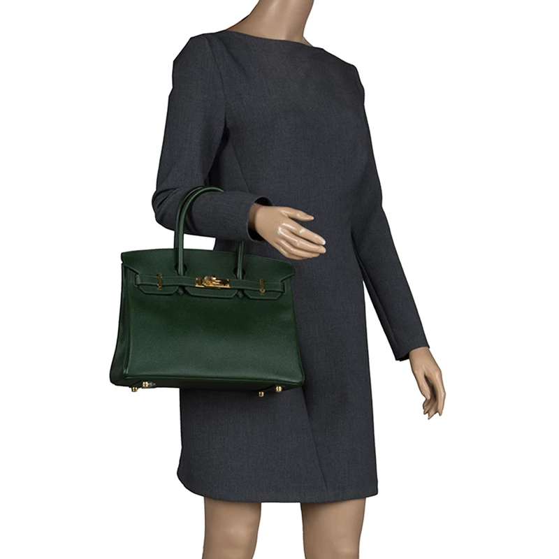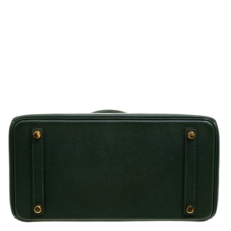 Hermes Birkin is one of the most desired handbags in the world. Handcrafted from the highest quality of leather by skilled artisans, it takes over 18 hours of rigorous effort to stitch a Birkin together. Crafted in France from green Epsom leather the beautiful bag is completed with dual top handles, gold-tone hardware, a padlock with its keys within the clochette, and protective feet at the bottom. The luxurious Birkin 30 has a spacious interior to hold all your daily necessities. The history and handiwork that comes with a Birkin profoundly elevate its value as a work of art and not just as a handbag. Durable and resistant to wear, the Birkin is a heritage that can last many years.