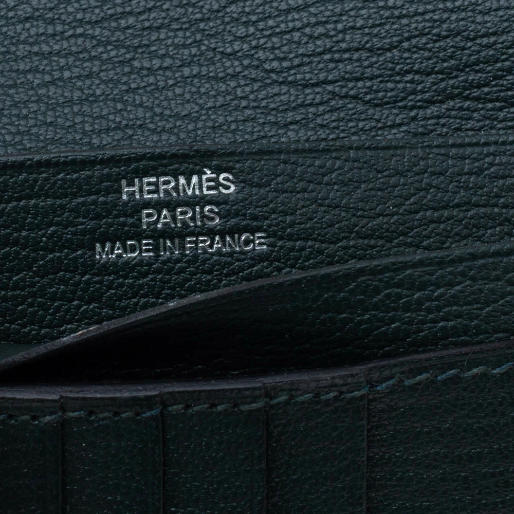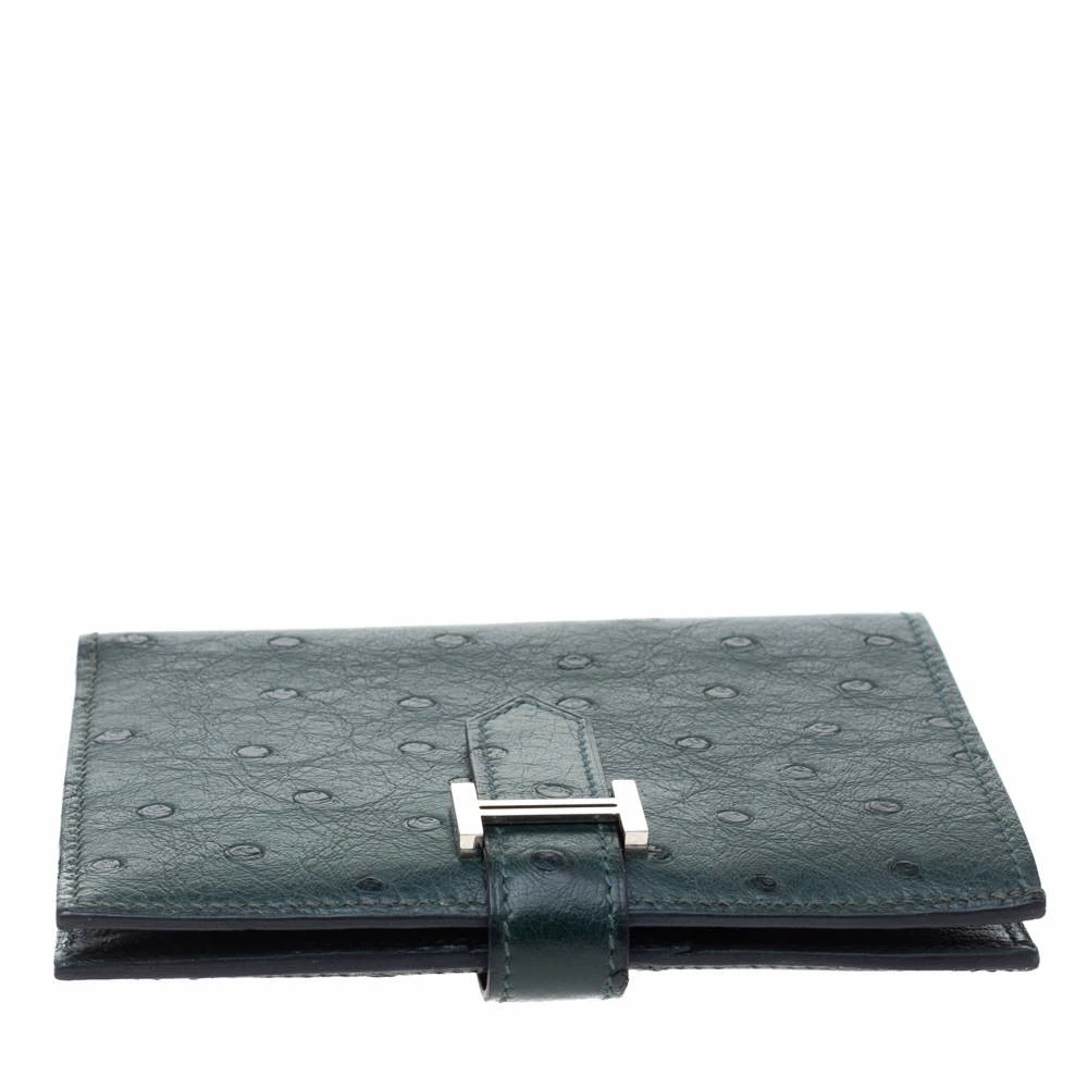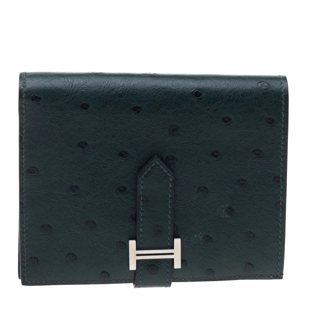 Luxuriously crafted by the experts at Hermes, this stunning Bearn wallet is a must have accessory for the luxury fashion lovers. Crafted in exotic ostrich skin, this wallet carries an elegant appeal and a sleek silhouette. It features a silver-tone H on the front strap button closure that opens to a leather-lined interior to complete the look. The interior is composed of multiple card slots, slip pockets and one zip pocket where you can conveniently store your cards, cash and bills. This wallet is a charmer that can be carried solo in the hand and can be stowed easily in one of the brand’s luxury bags. (NOTE: For UAE customers Only)