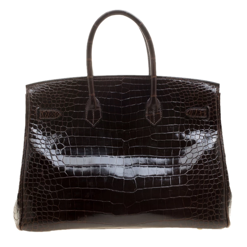 Hermes is known for its flawless craftsmanship and high quality. The Hermes Birkin was inspired by Jane Birkin and is one of the most desired handbags in the world. A timeless classic that never goes out of style. The gorgeous creation is handcrafted from the highest quality of leather by skilled artisans and it takes over 18 hours of rigorous effort to stitch a Birkin together. Crafted in France from Dark Marron Porosus Crocodile skin leather, this bag features a padlock with its keys within the clochette and dual top rolled handles. This wondrous Birkin 35 comes with gold-tone hardware and has a spacious leather lined interior that can hold all your daily necessities and more. Durable and resistant to wear invest in this collectible as it can be easily passed on to the next generation!