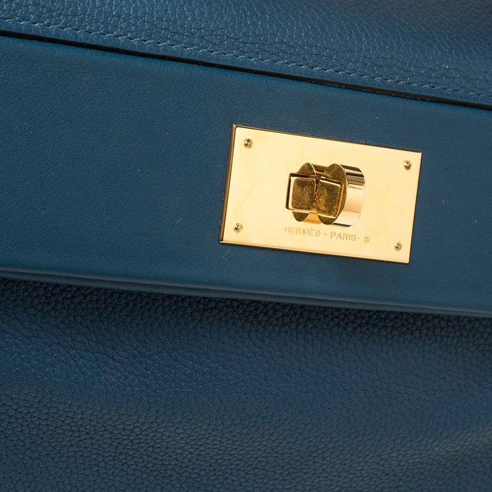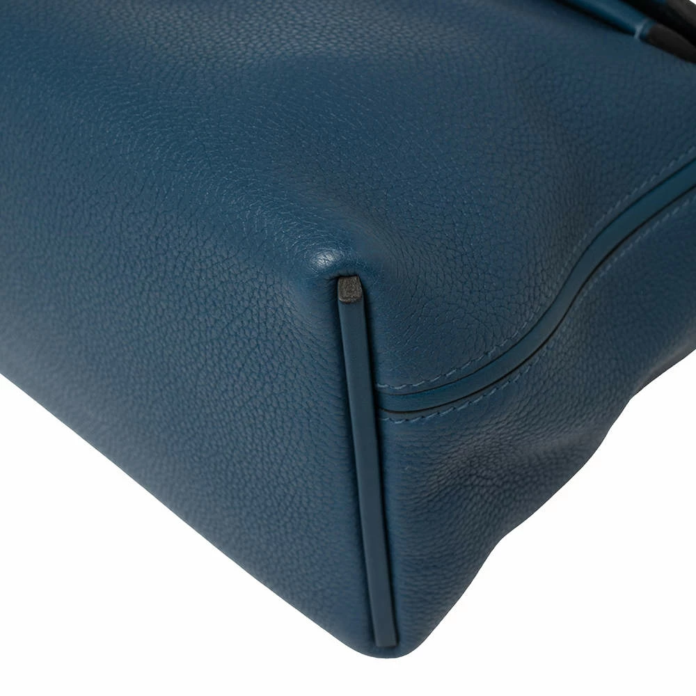 The 24/24 by Hermès appears similar to the iconic Kelly, but with a most relaxed, casual tone. Studying the details, the bag has a top handle and a shoulder strap, signature twist lock on the flap, a back pocket, and a roomy interior. This version is crafted in Togo leather, and the hardware is in gold.